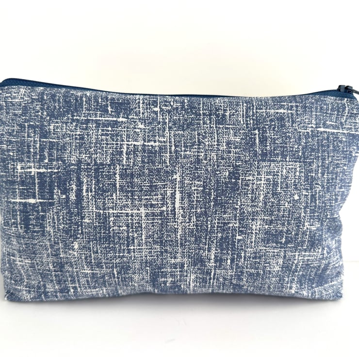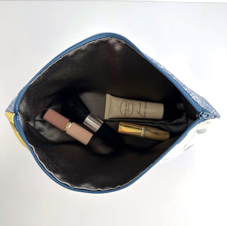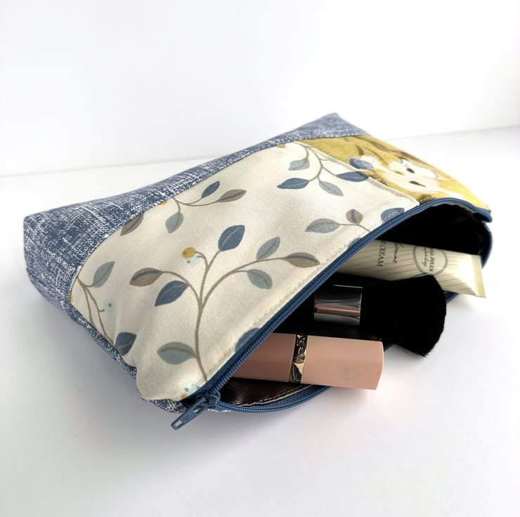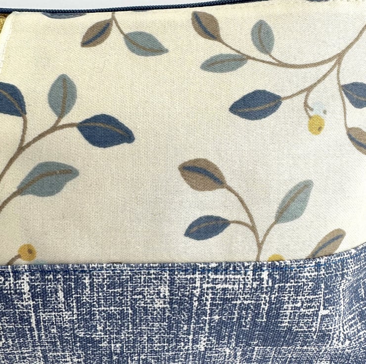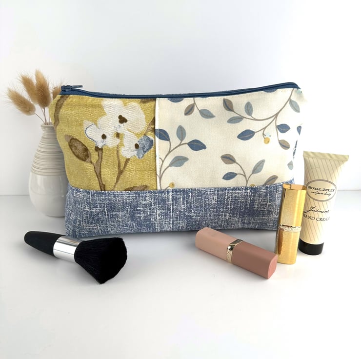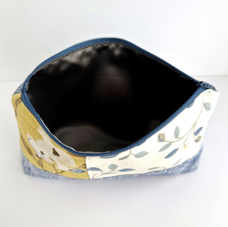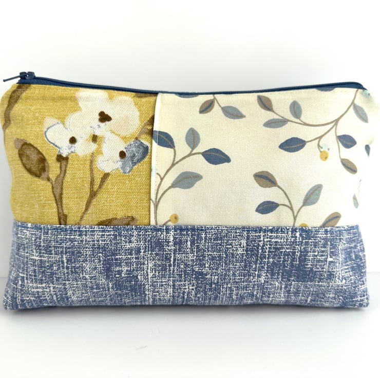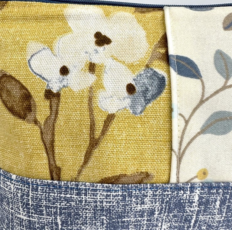 This handy large sized make up bag is made from three lovely print fabrics which complement each other beautifully. The front of the cosmetic bag has three panels. The upper part of the front of the bag is made up of two asymmetric panels. The wider panel features a delightful pattern of leaves and berries depicted in shades of blue, beige and mustard yellow, on a cream background. The narrower panel is made from a floral print fabric in shades of blue, white and brown on a mustard yellow background. The lower section of the front, and the entire back, are made from blue fabric with a pattern of white flecked, criss-crossed lines. The make up bag fastens with a matching blue zip and is lined with grey satin. The base of the bag is boxed giving plenty of room inside.