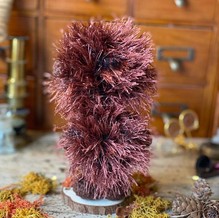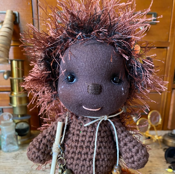 Bristle stands approx. 6 inches tall, he is crocheted from brown coloured aran cotton yarn, and his head and back are also crocheted from a brown/black eyelash art yarn, to give the illusion of bristles. His head is moulded and is covered with interlock jersey. He has black bead eyes and an embroidered nose & mouth, his cheeks blushed with bee's wax. He is stuffed with carded lamb's wool and is quite firm when squeezed.