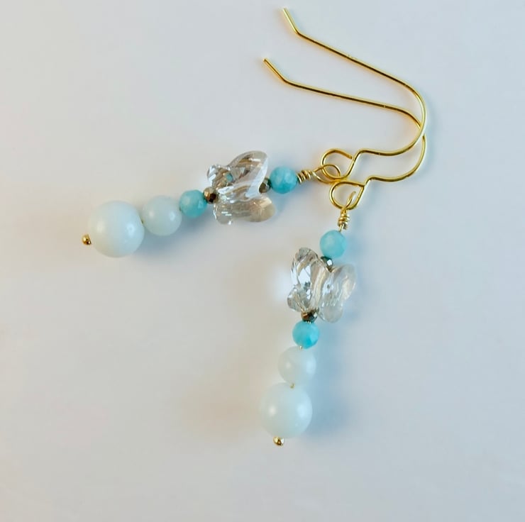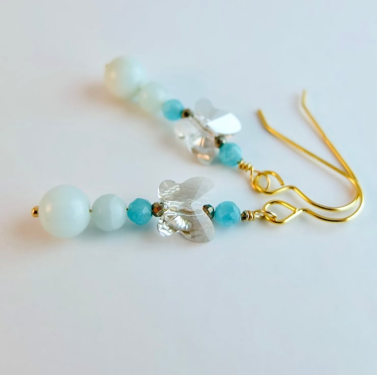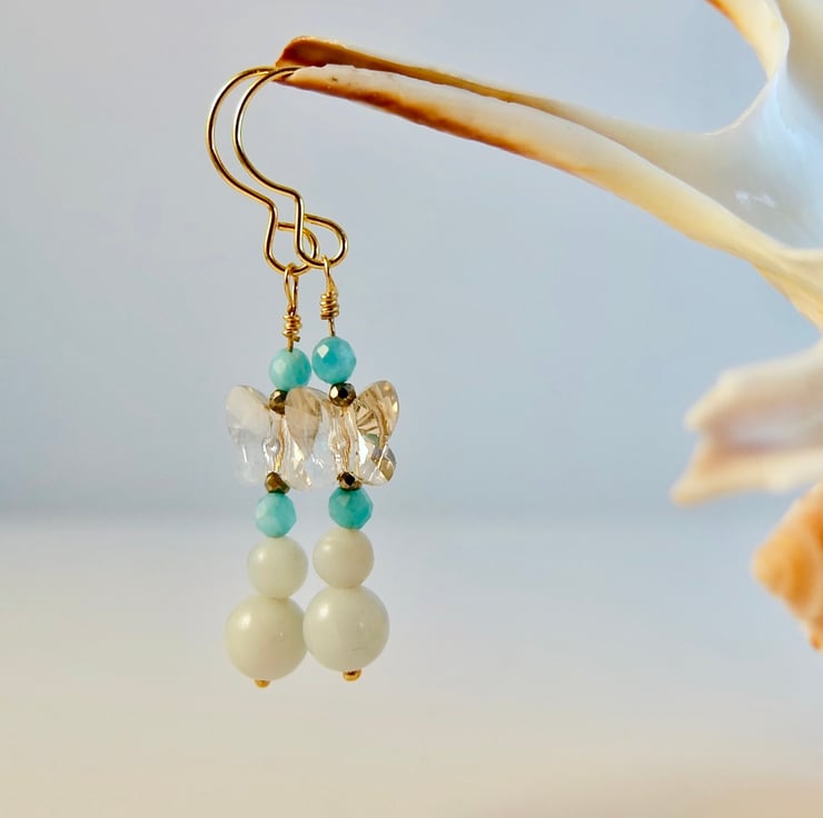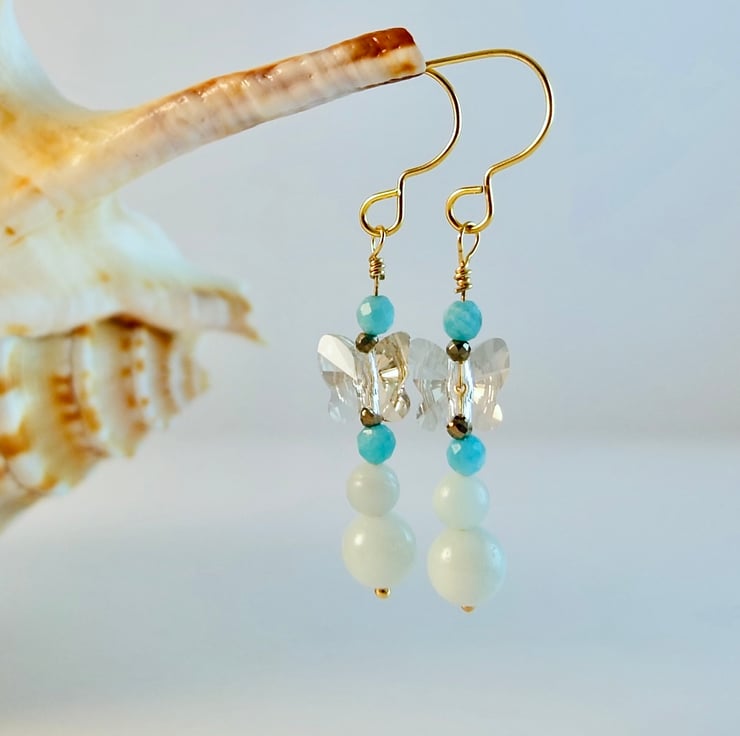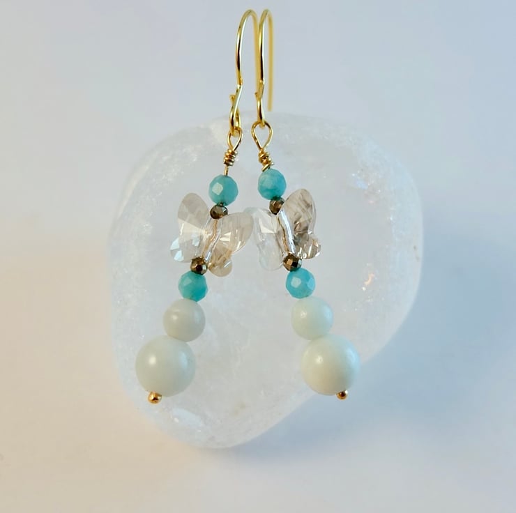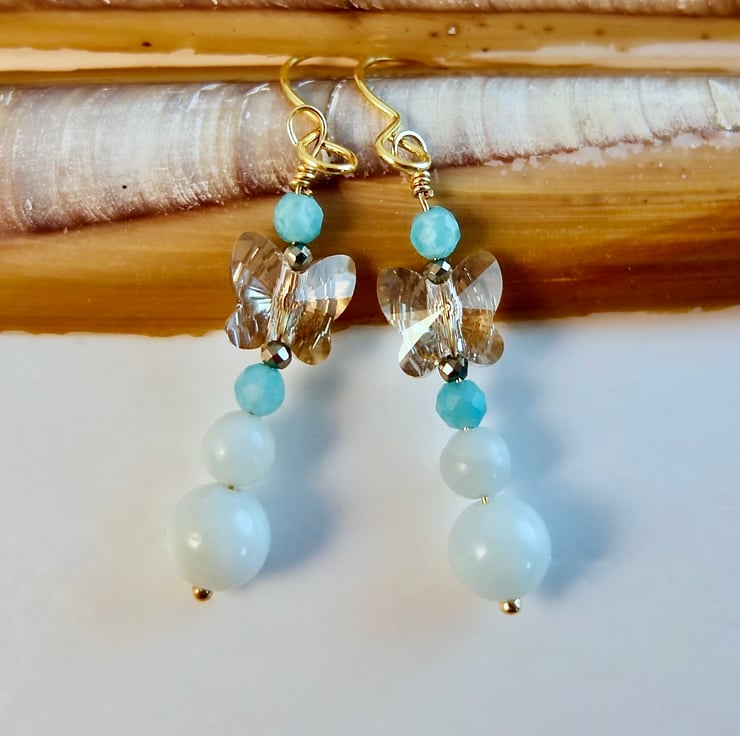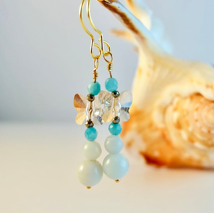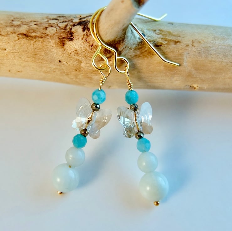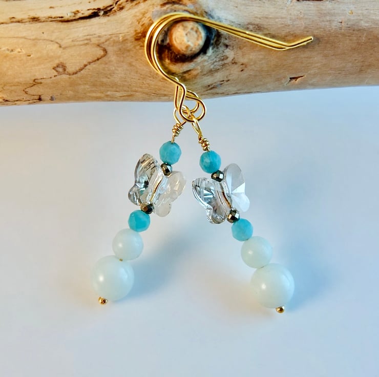 Amazonite Earrings With Swarovski Crystal Butterflies - Handmade In Devon