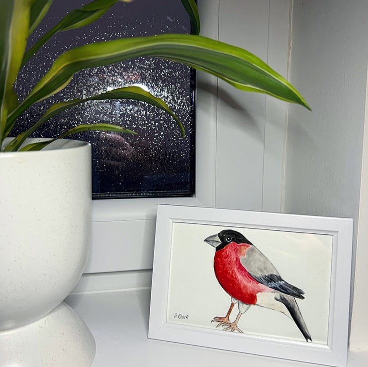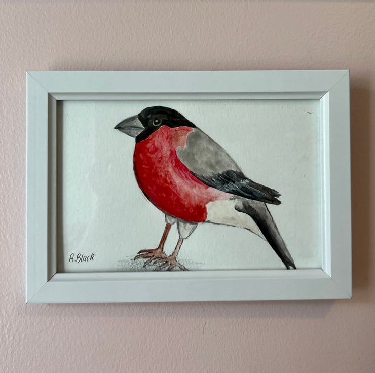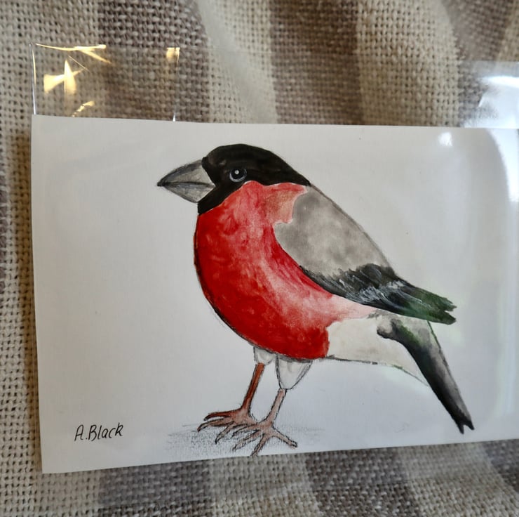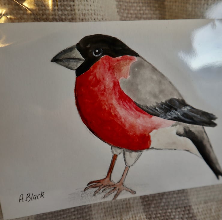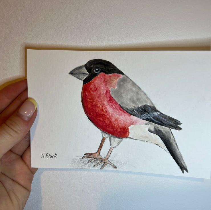 Bullfinch painted on 6x4” watercolour card using an array of fine watercolours.