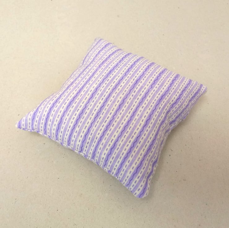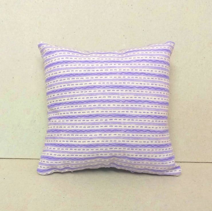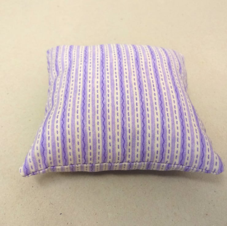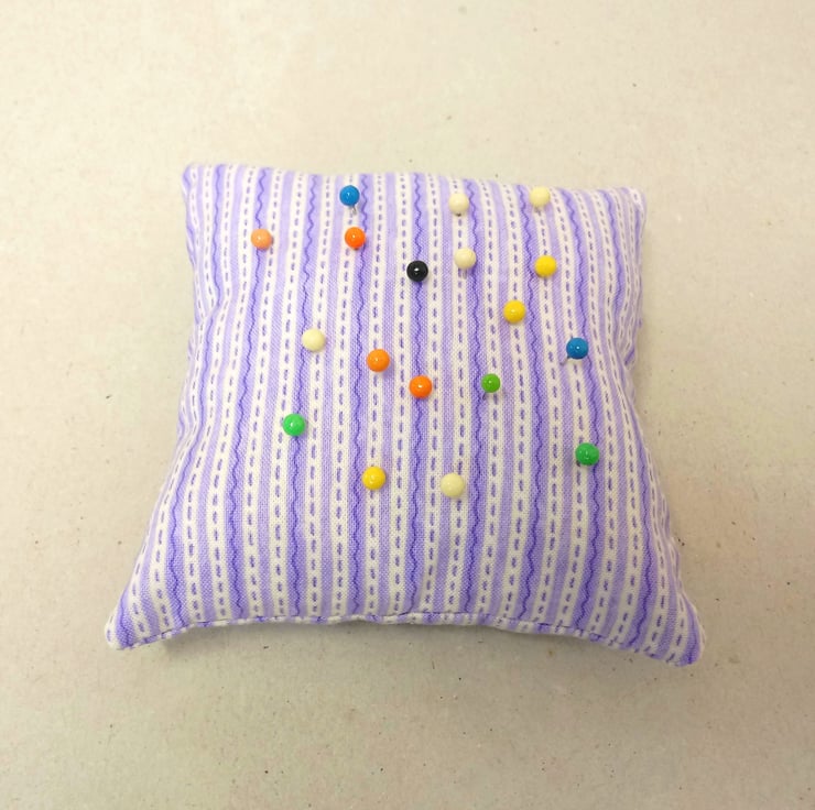This is a lovely pin cushion in lilac and white stripes.