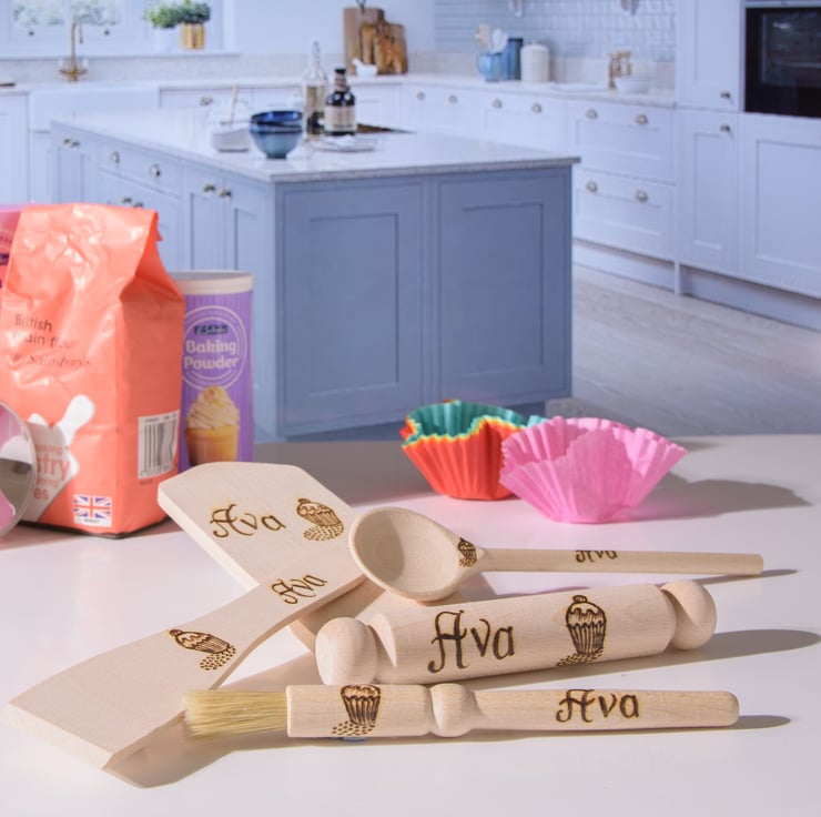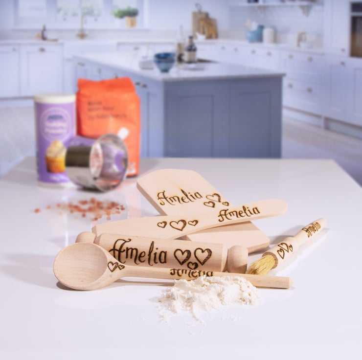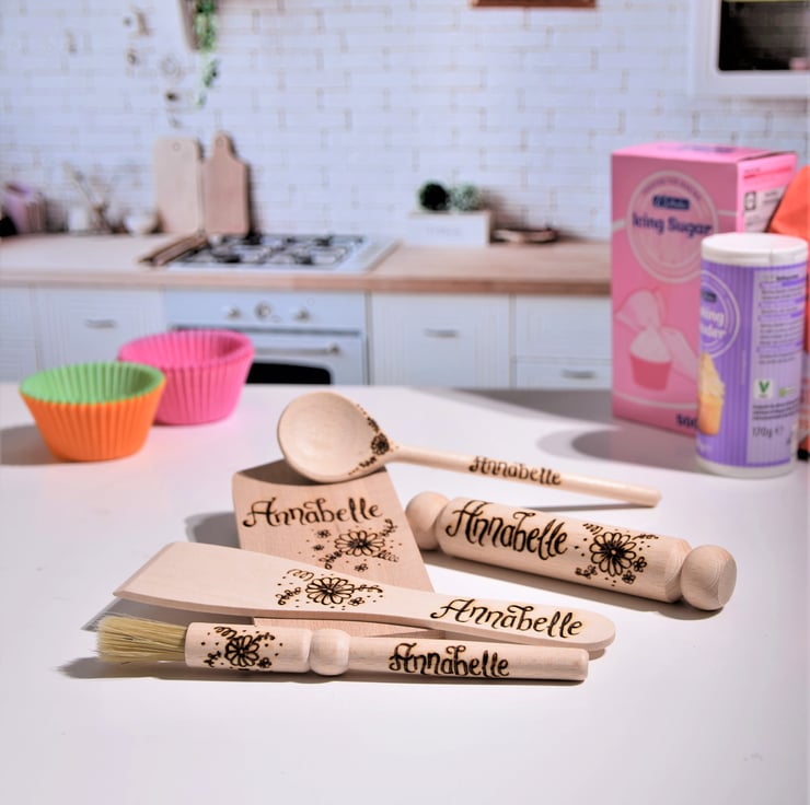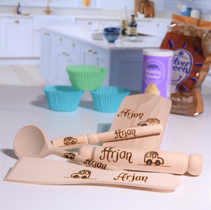 This sweet little set is made of wood and can be engraved with the name and motif of your choice - perfect gift for a little star baker!