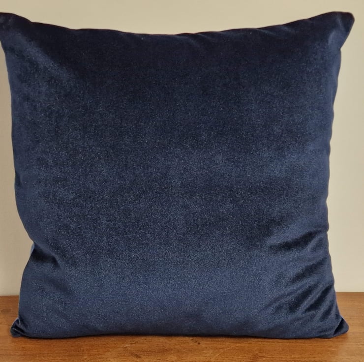 The back fabric is a reclaimed, plain, good quality, dark blue coloured velvet, giving the cushion cover a luxury feel.