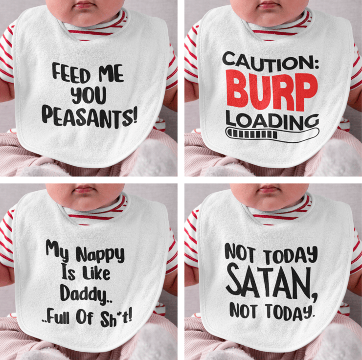 Funny Novelty Baby Bibs - New Baby Joke Gift - Themed Baby Bib Variations