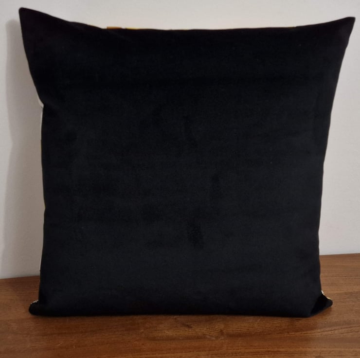 The back fabric is a reclaimed, good quality, black velvet fabric, giving the cushion cover a luxury feel.