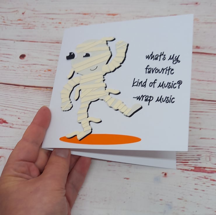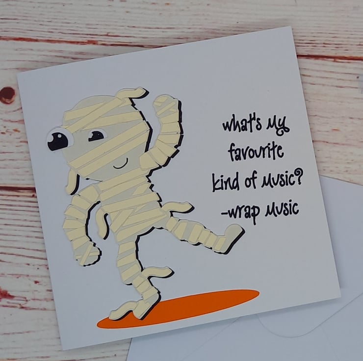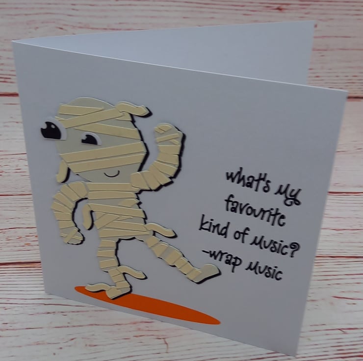 Featuring a cartoon Mummy telling a joke - 'What's my favourite kind of music? Wrap music!' this card is certain to raise a smile.