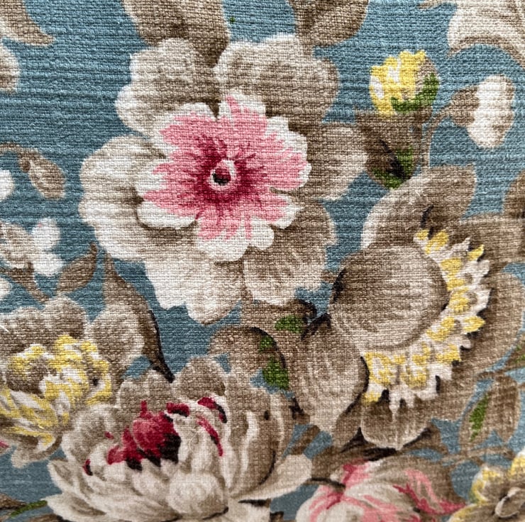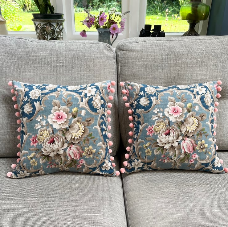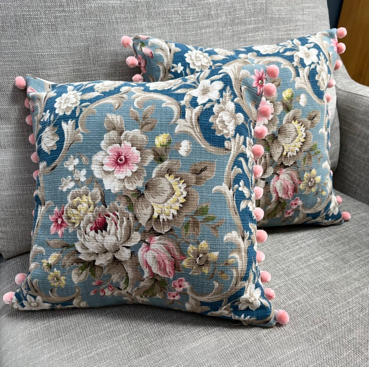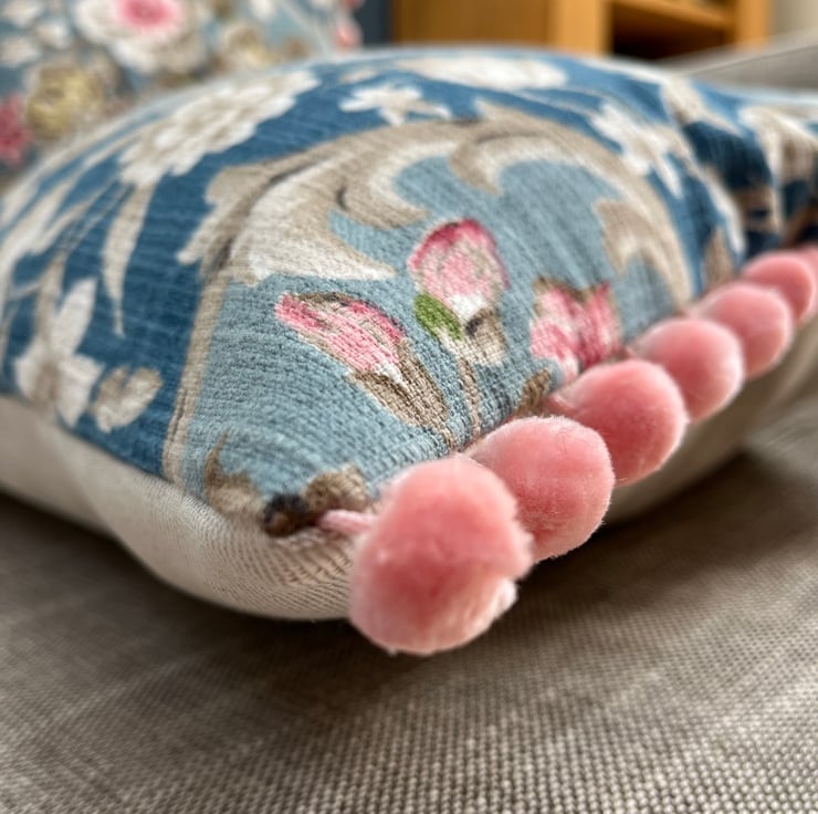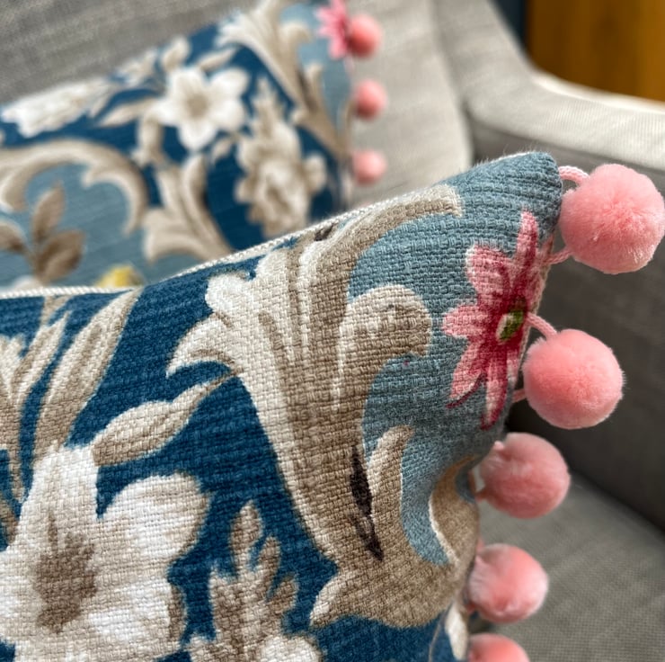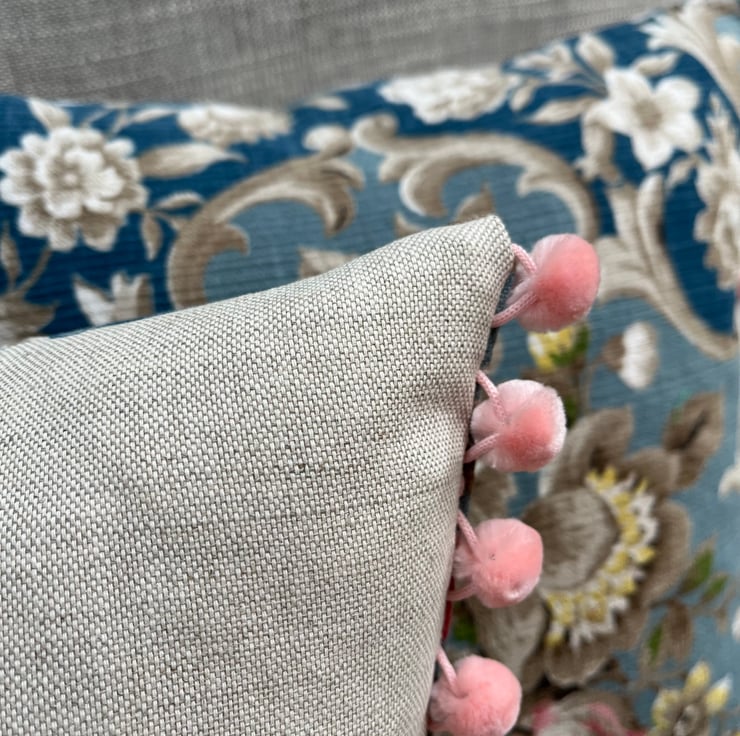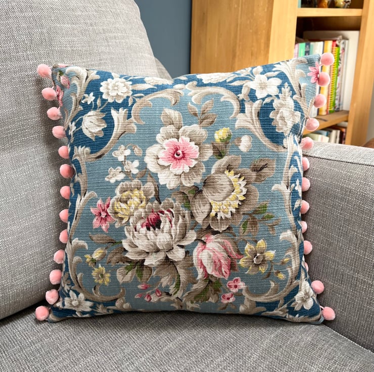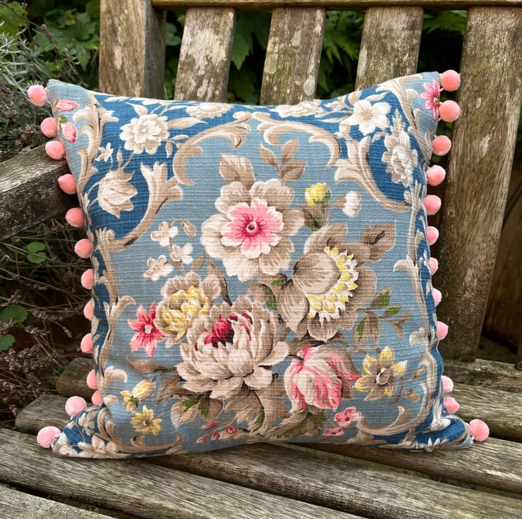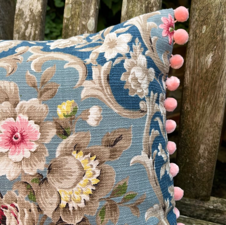 Beautiful cushion cover made from reclaimed vintage linen-mix fabric with a colourful floral bouquet on a mid-blue background. The sides are trimmed with velvety pink pompoms which pick out the pink in the flowers. The cover is backed with plain oatmeal linen.
