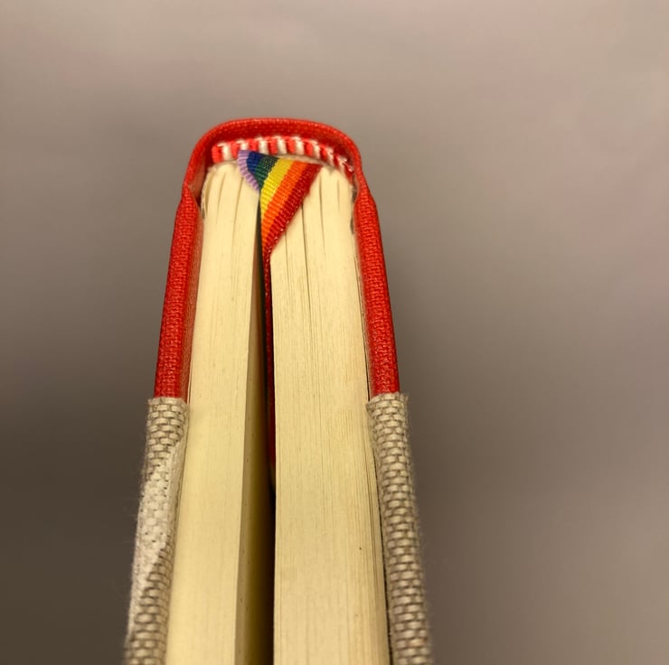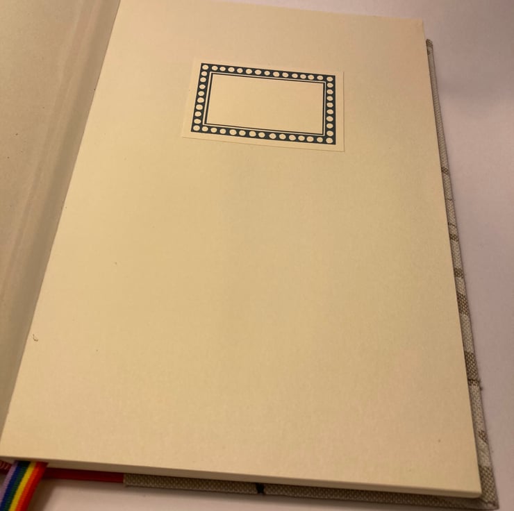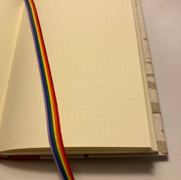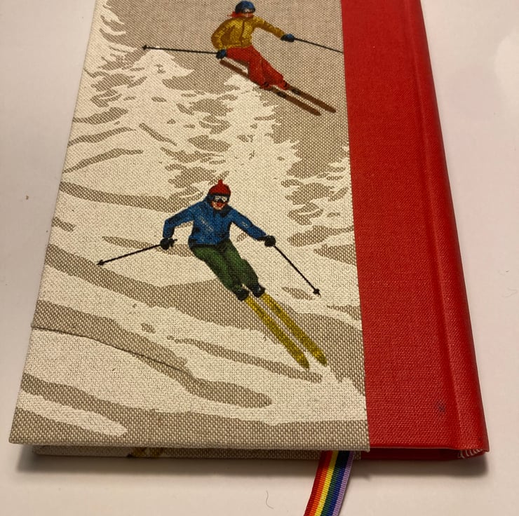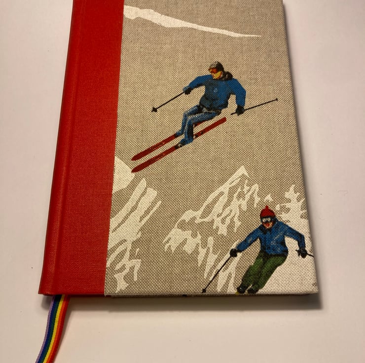 A5 Ski themed bullet journal with 224pp cream dot print paper, covered with red bookcloth on the spine, linen style material featuring skiers, red and white endbands, a rainbow grosgrain ribbon marker and a Cambridge Imprint name label on the inside page. I have made a few like this, each one slightly different.
