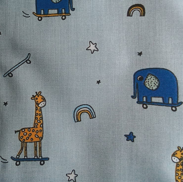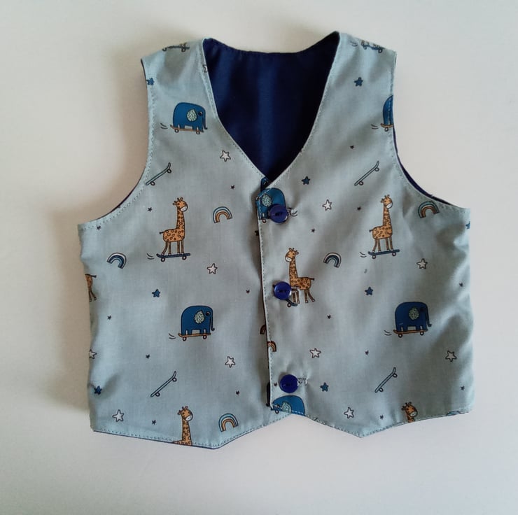 Age 6-9 months Waistcoat with giraffes and elephants skateboarding design fabric.