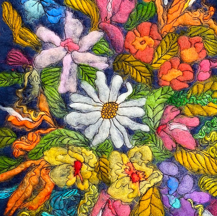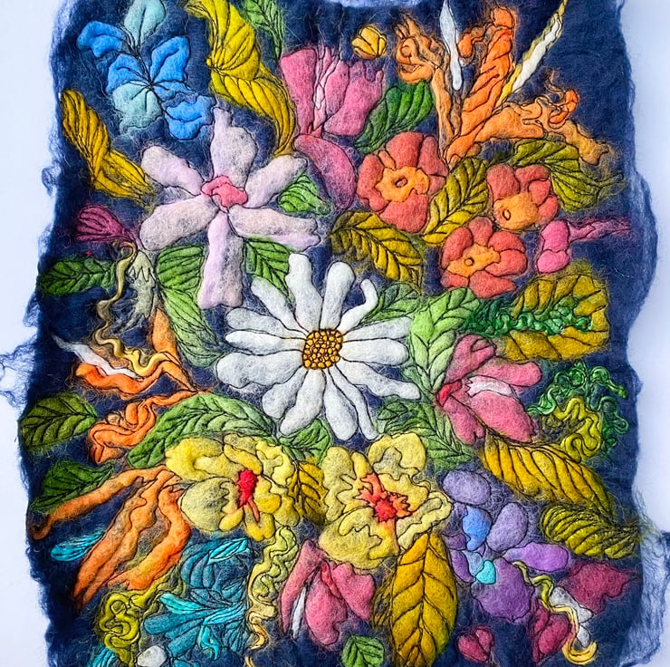 This gorgeous flower piece is called ‘Summer Border’. It’s a wet felting with free motion embroidery. It comes backed and signed.