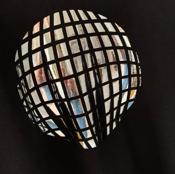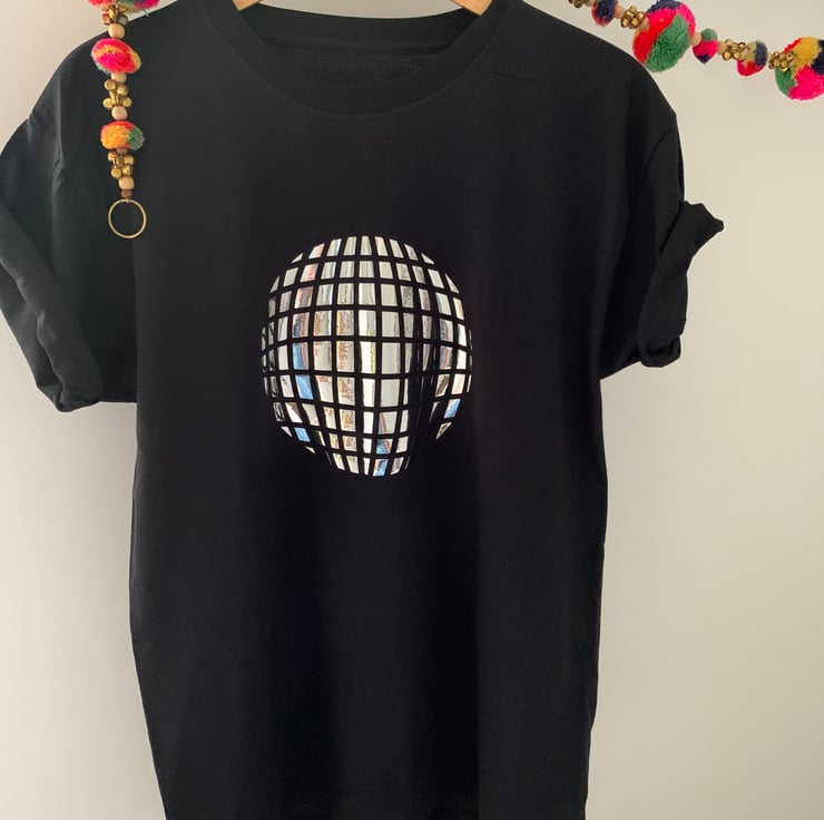 Silver Shiney glitter ball design on a relaxed fit tshirt.