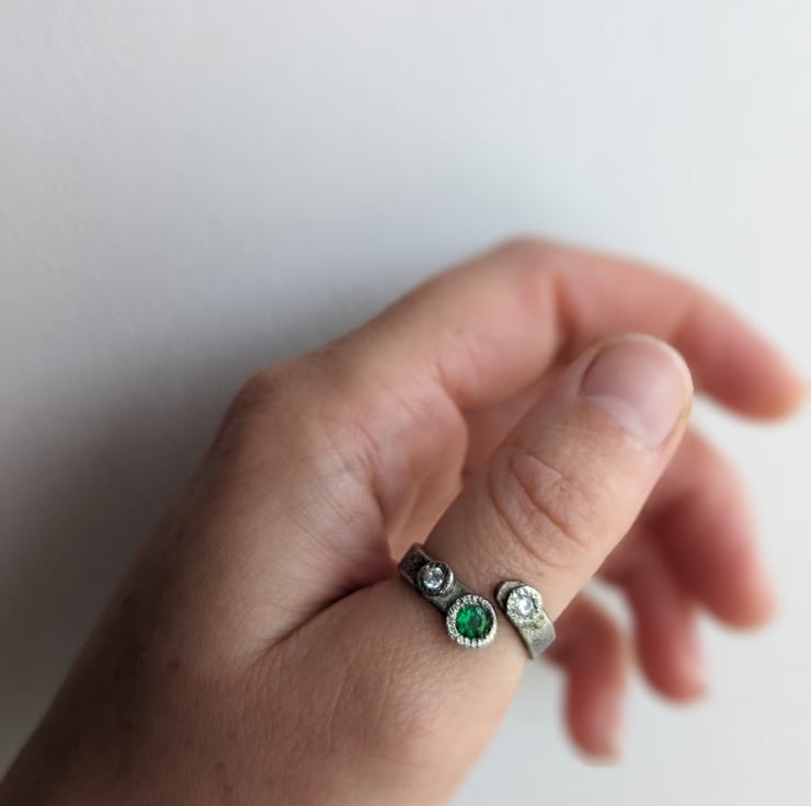 The textured and oxidised ring has an aged and weathered aesthetic, contrasting with the sparkle of the green and clear glass stones, set in textured bezels. This ring is intriguing and quirky - it is chunky enough to make a small statement but lightweight and small enough to not steal the show from your other rings. (There is a matching pendant to accompany the ring perfectly)
