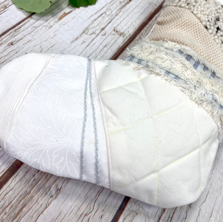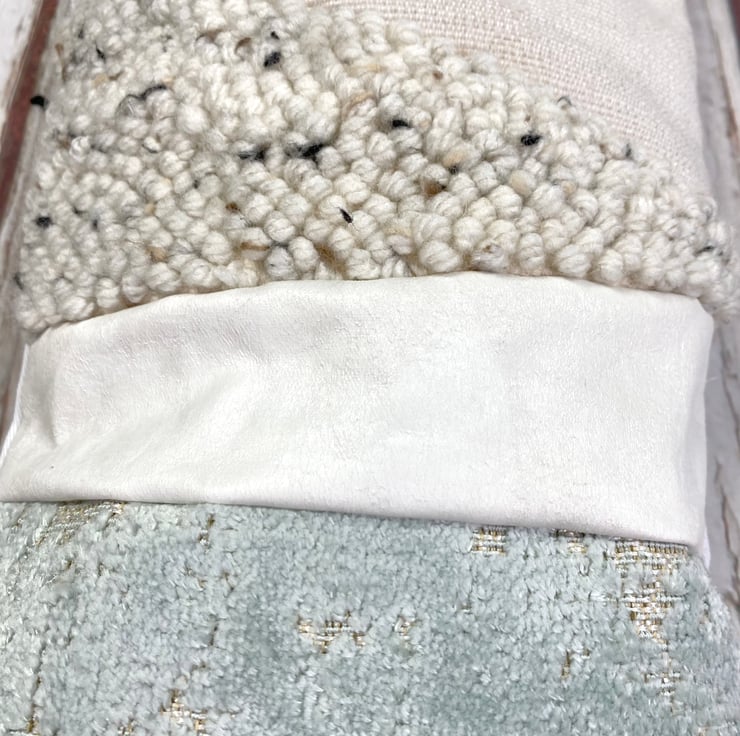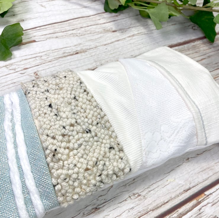 Anyway, they're made up of different sections of fabrics and textures. One of the sections is punch hooked with a chunky cream flexed wool to give a lovely soft textured area other sections are built up with more fabric, lace, cottons, cord, upholstery fabric or pops of wool. The hook is a white cotton to coordinate. It's backed with a sturdy white twill too.