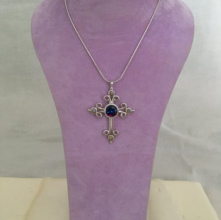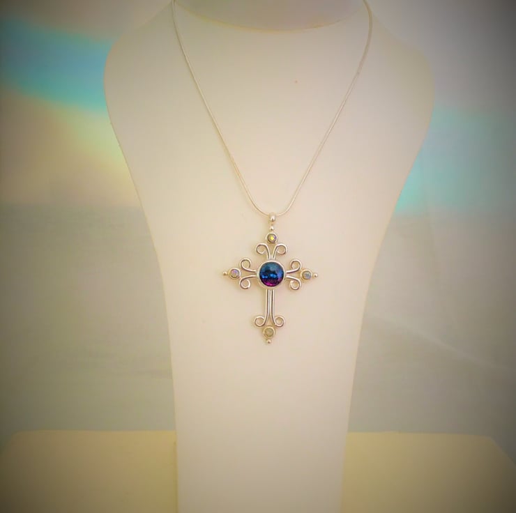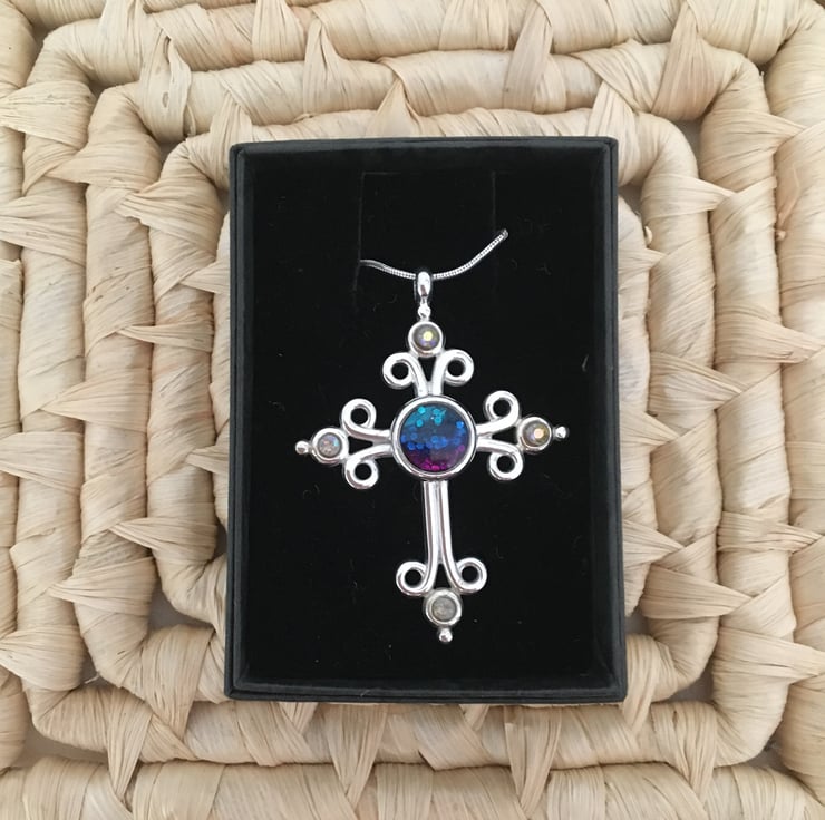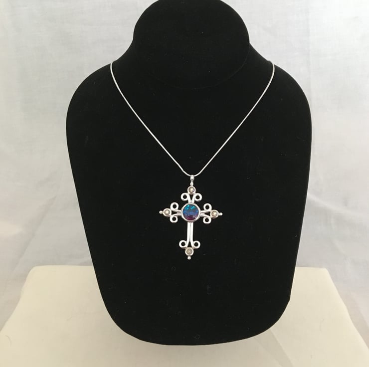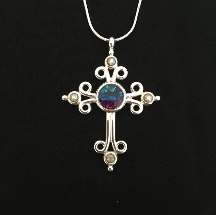 Bold handcrafted tri-coloured cross pendant in a quality silver plated setting.