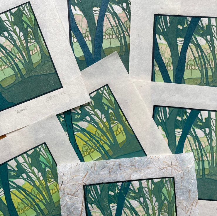 A reduction print is a relief print formed with layers of colour that are cut and printed multiple times from the same block. Once the print is finished the block can have very little left on it. Reduction prints are in nature limited to a small edition number. This reduction print is created from 9 layers of colour.