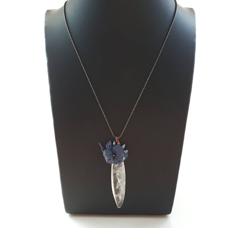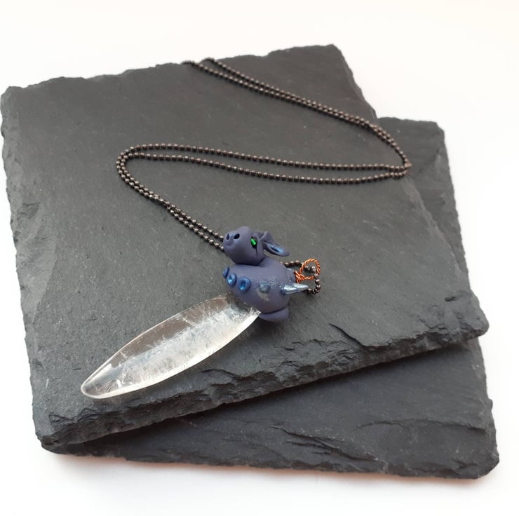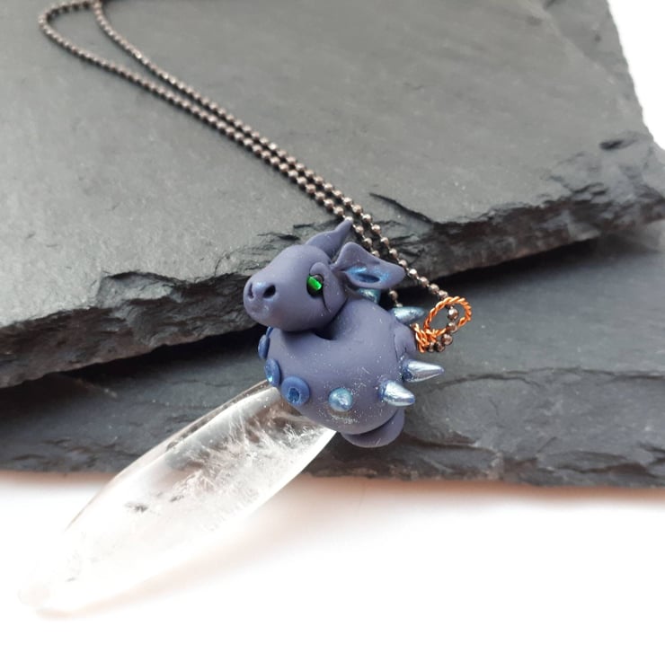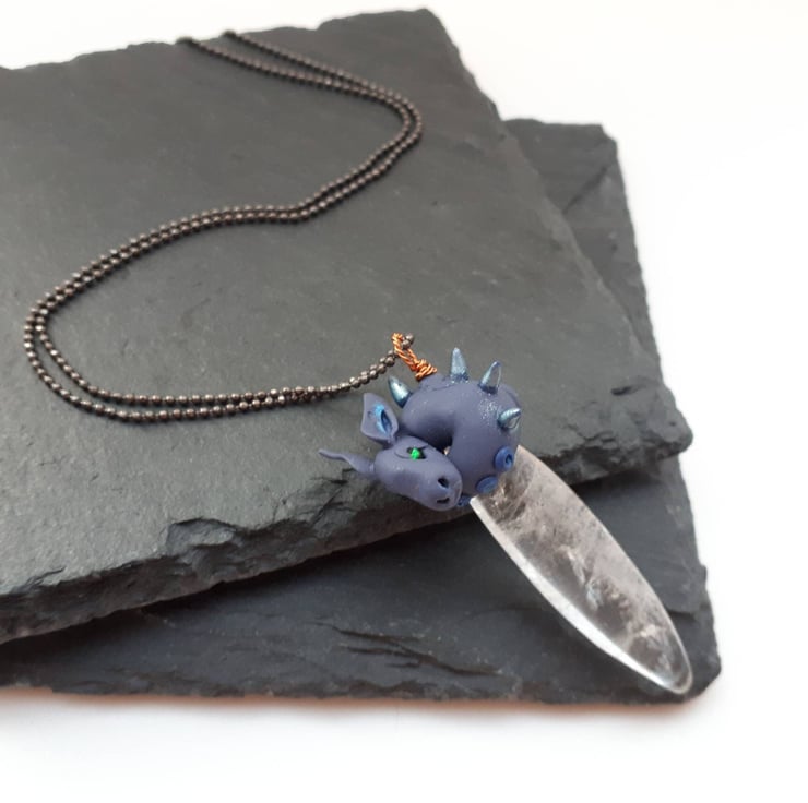 The dragon is made from polymer clay, curled around a smooth crystal quartz bead, and the pendant is 50mm long in total. The fine gunmetal coloured brass ball chain is 30 inches (76cm) long, long enough to go over your head although it does have a tiny fastening.