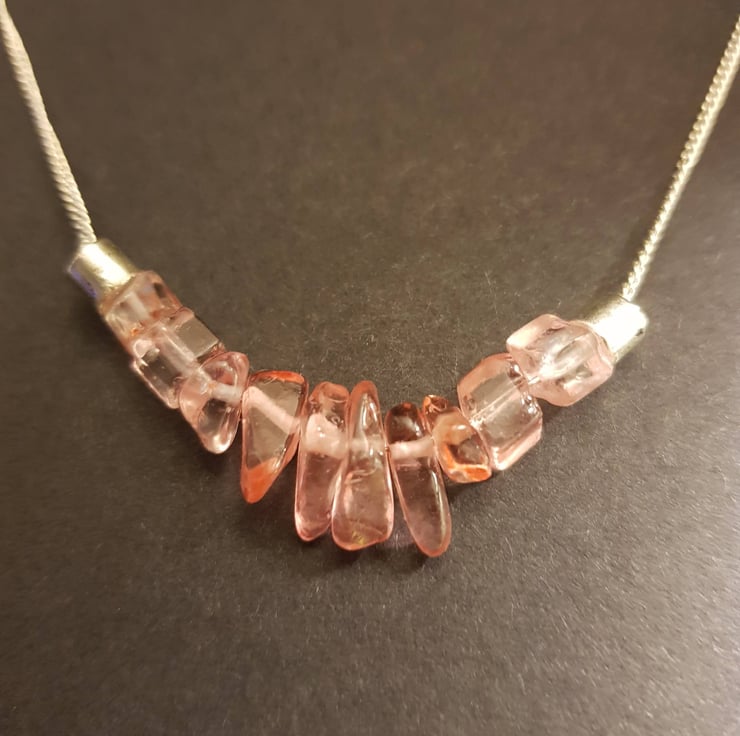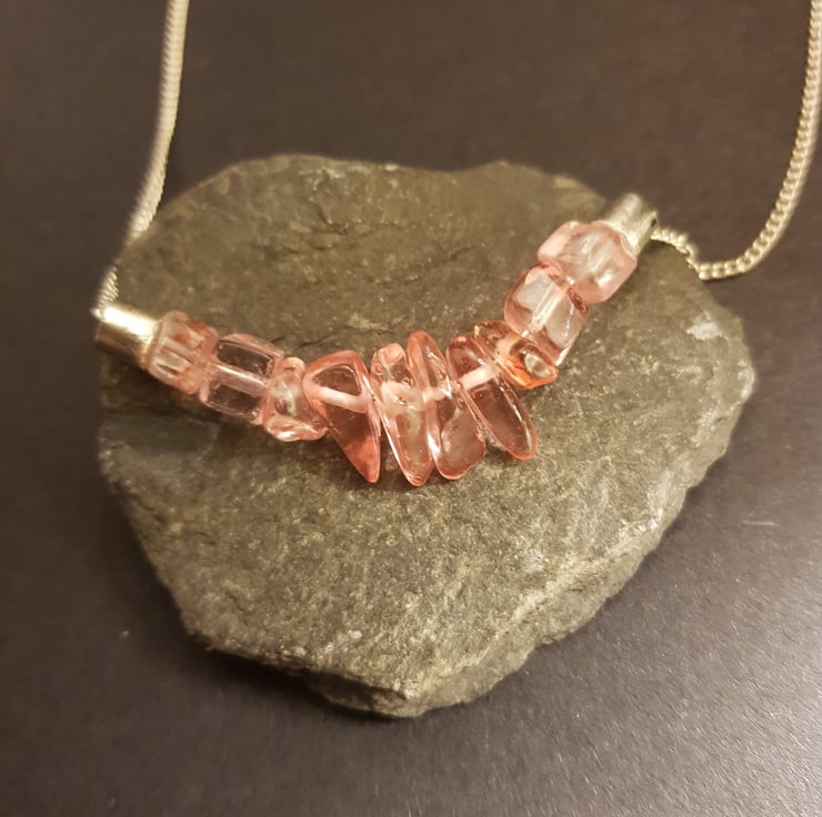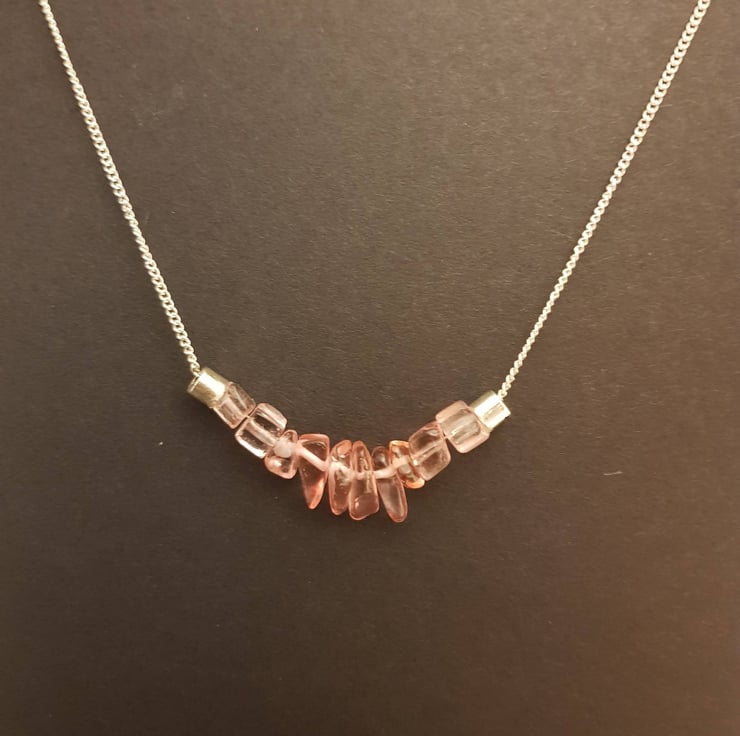 This stunning handmade Heart Chakra bar necklace comprises of 10 delicate Rose Quartz chip beads on a pretty chain with a lobster clasp. Rose Quartz is a Heart Chakra crystal and is considered a Crystal of Unconditional Love. A stone of the heart, compassion and peace.