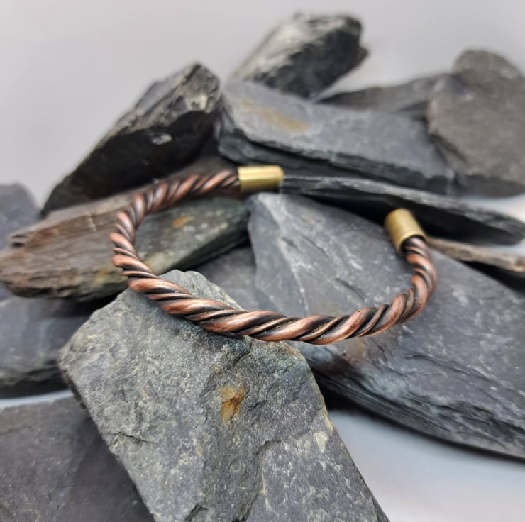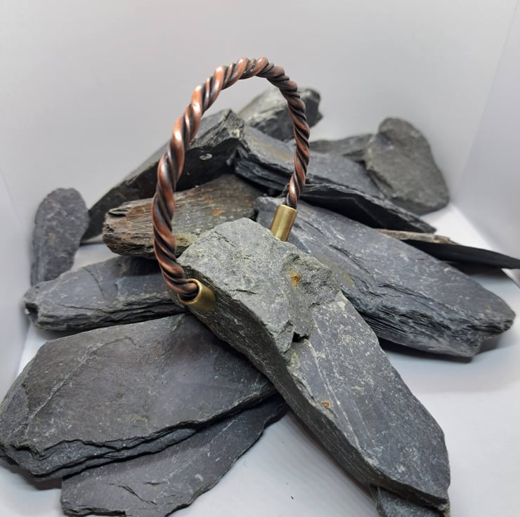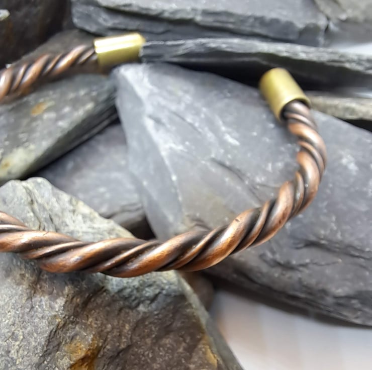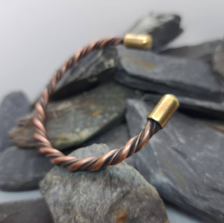 Elevate your style with the Twisted Celtic Copper Torc Bracelet with Brass Endcaps. This handcrafted bracelet showcases a captivating fusion of copper and brass, creating a visually appealing contrast that adds a touch of sophistication to its rustic charm. The adjustable design allows for a customized fit, ensuring a comfortable and personalized experience for both men and women.