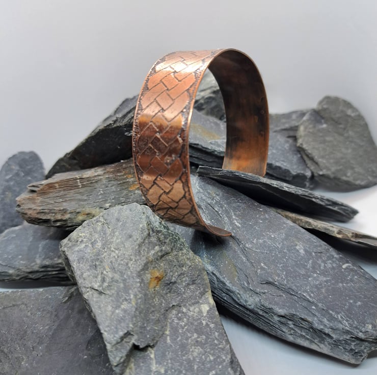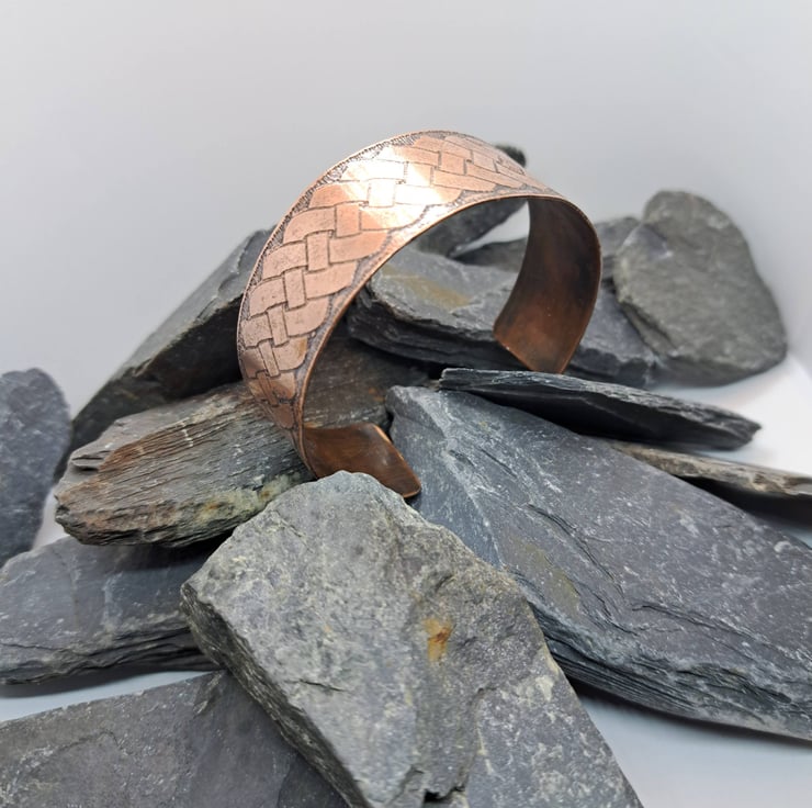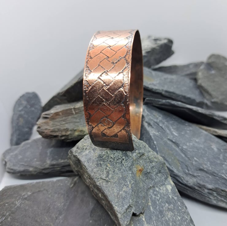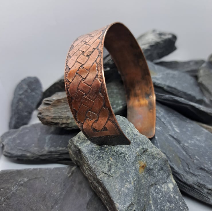 Enhance your style with this captivating etched Celtic copper cuff bracelet adorned with a mesmerizing stylized Celtic knot pattern. Skilfully handcrafted, it showcases the timeless allure of Celtic design infused with a traditional knotwork design. The rustic boho-inspired style adds a touch of enchantment and individuality to this remarkable accessory. It is adjustable. Customize the size by gently squeezing or expanding it for a comfortable fit.