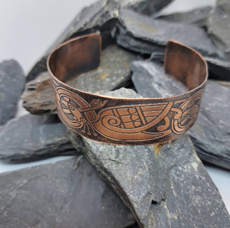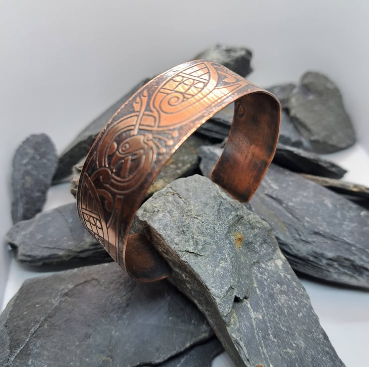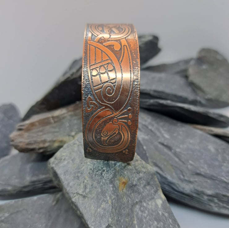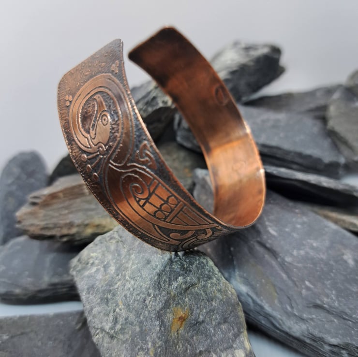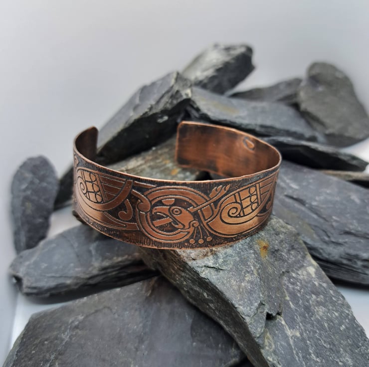 Enhance your style with this captivating etched Celtic copper cuff bracelet adorned with a mesmerizing stylized Celtic bird pattern. Skilfully handcrafted, it showcases the timeless allure of Celtic design infused with an artistic avian motif. The rustic boho-inspired style adds a touch of enchantment and individuality to this remarkable accessory. It is adjustable. Customize the size by gently squeezing or expanding it for a comfortable fit.