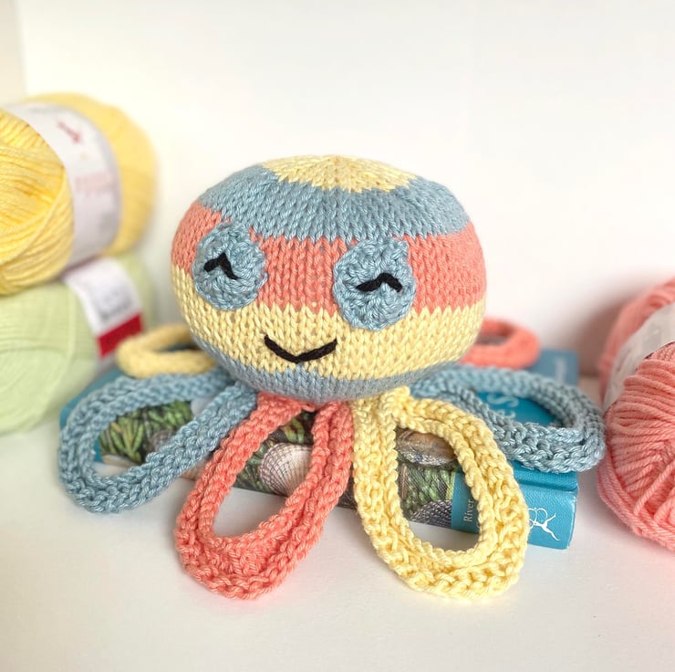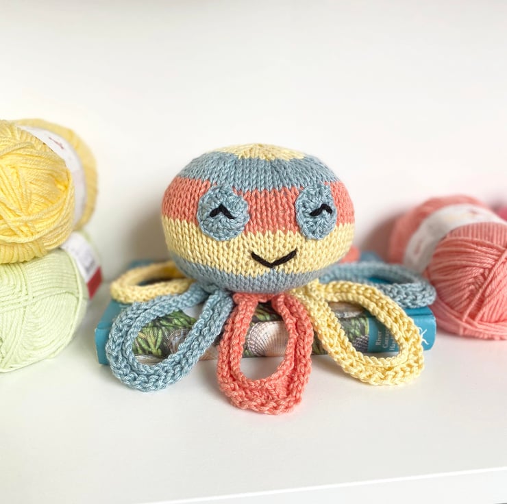 The Jolly Jellyfish is a cheerful chap, knitted from small amounts of Dk yarn. A colourful quick make and perfectly sized for small hands to hold!