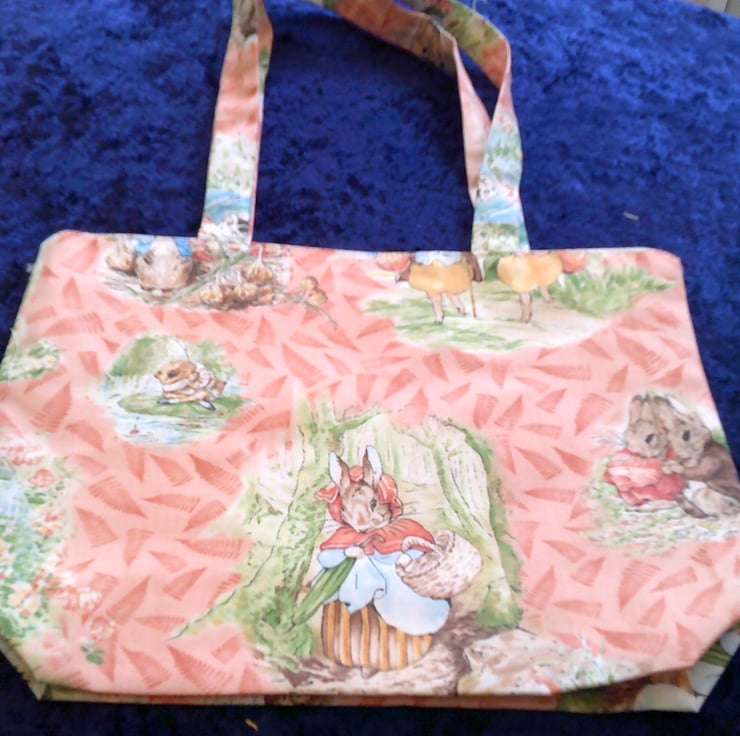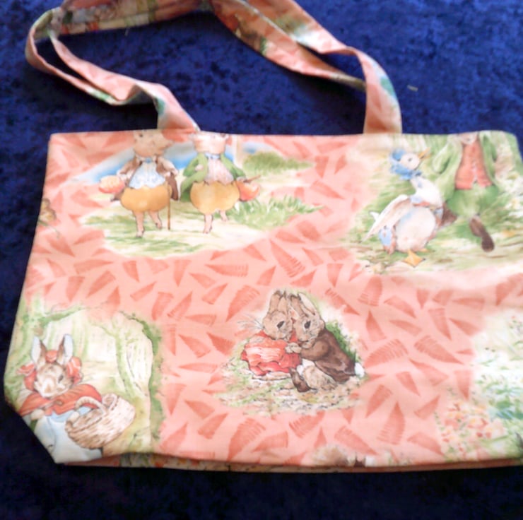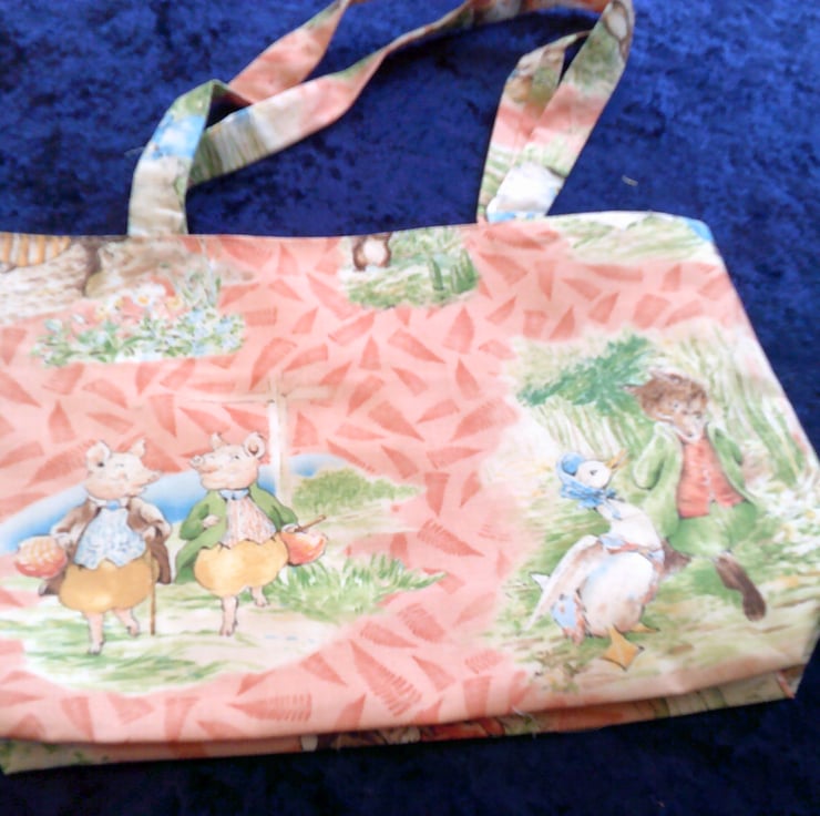 This Eco Friendly, fabric bag is made using 100% Cotton and features Tales from Beatrix Potter including Jeremy Fisher, Jemima Puddleduck and Pigling Bland on a Peach background. It is fully lined and machine washable.