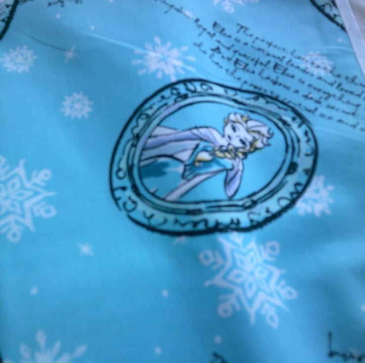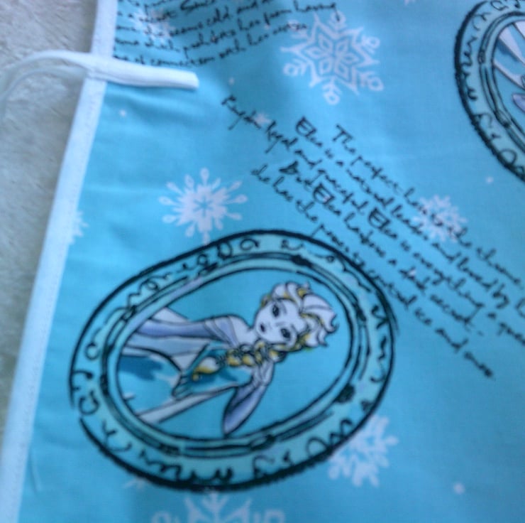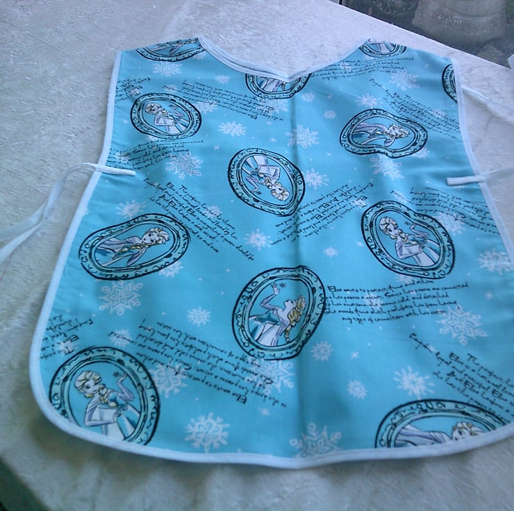 This child's tabard is made using 100% cotton fabric and has a design of Elsa from Frozen in White frames on a Turquoise background and is edged with a contrasting white bias binding. here is a pocket on the front and ties on the sides