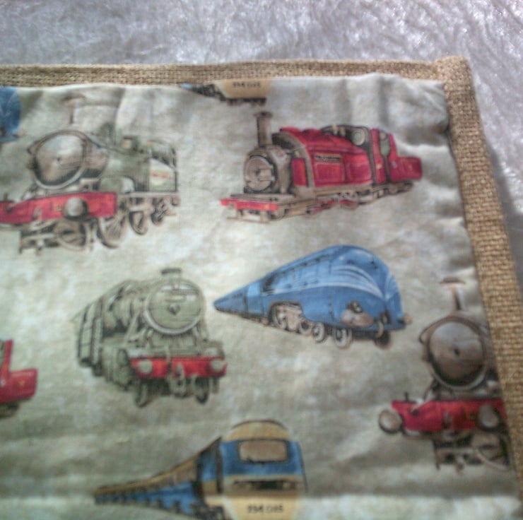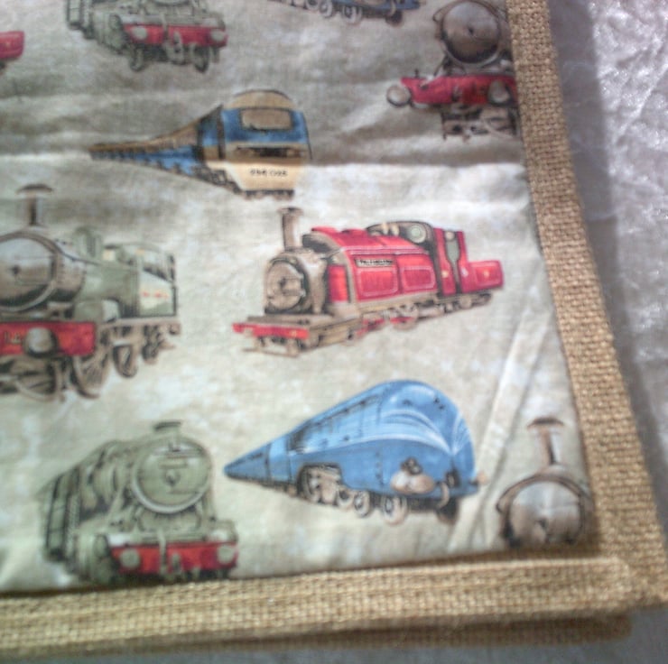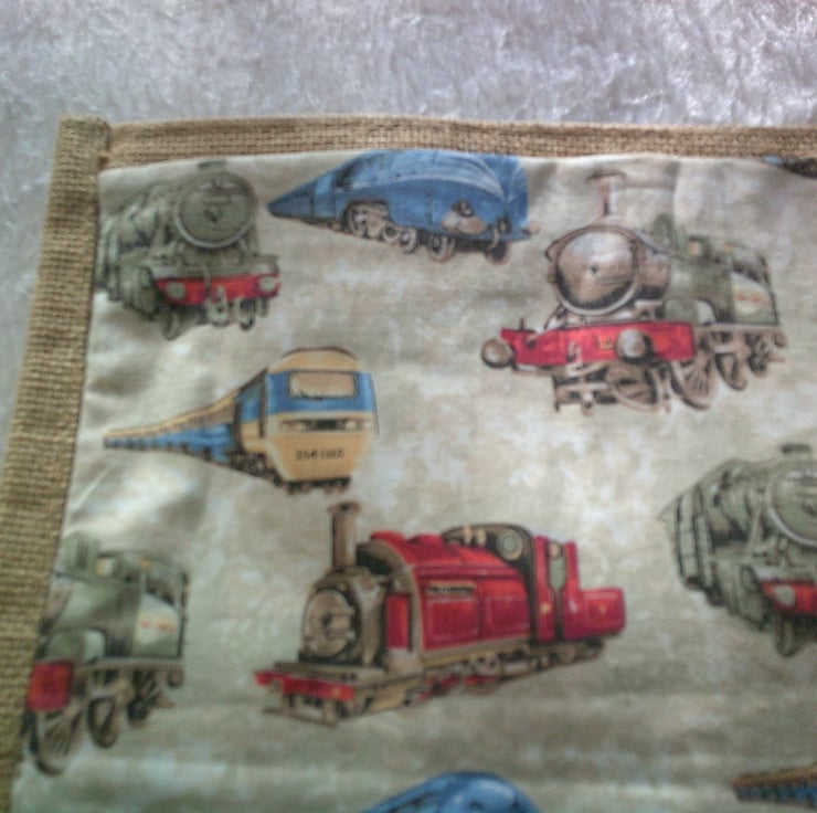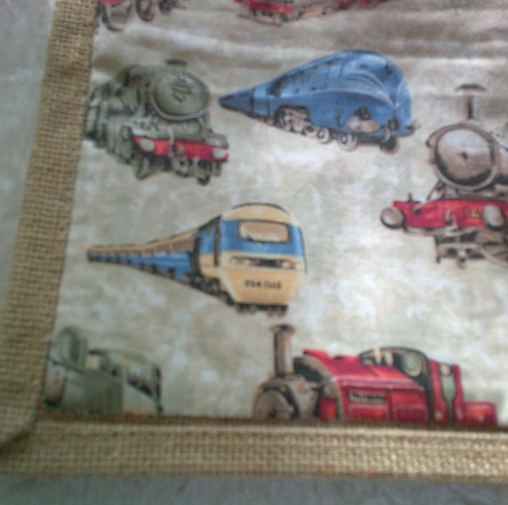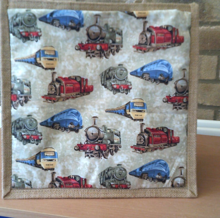 The bag itself measures approximately 30 x 30 x 20 cm (12 x 12 x 8 inches). The fabric pocket - which has been hand sewn onto the bag is a panel featuring Trains on a dark cream background.