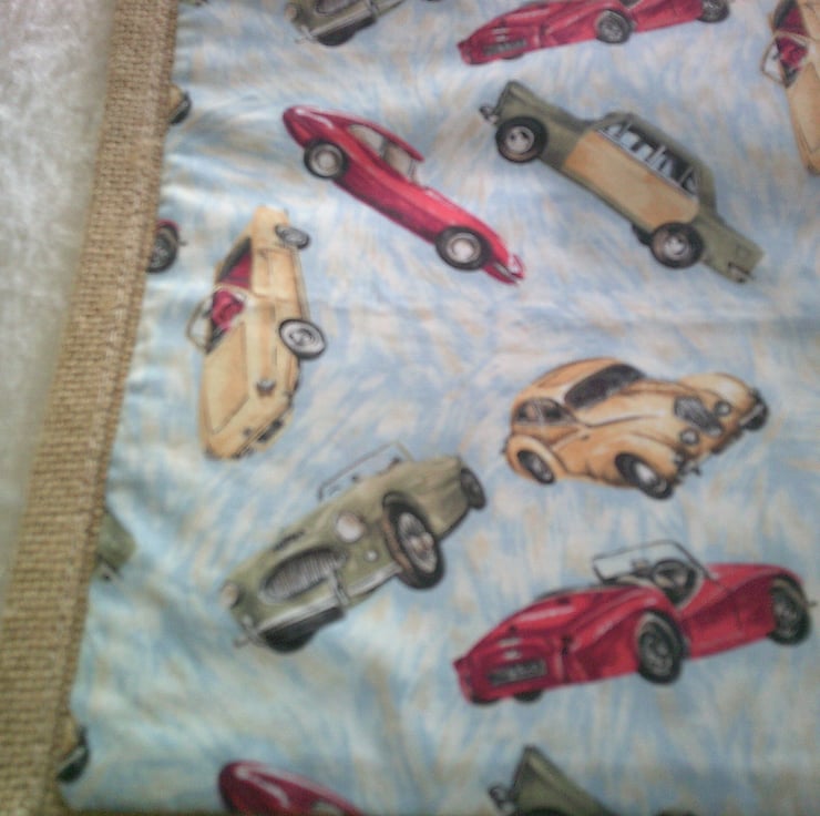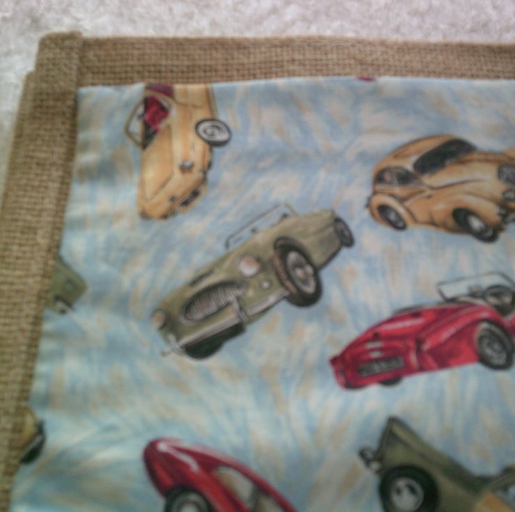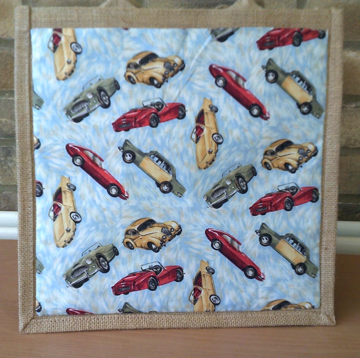 The bag itself measures approximately 30 x 30 x 20 cm (12 x 12 x 8 inches). The fabric pocket - which has been hand sewn onto the bag is a panel featuring Classic Cars on a pale blue background.