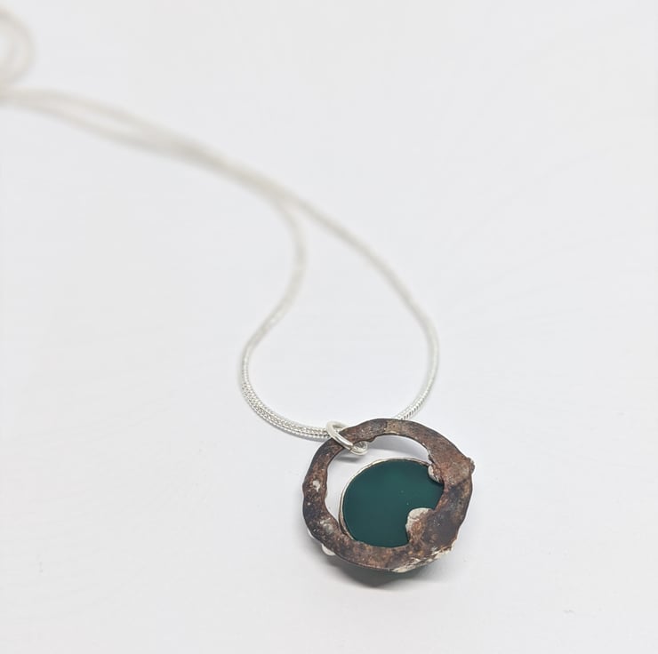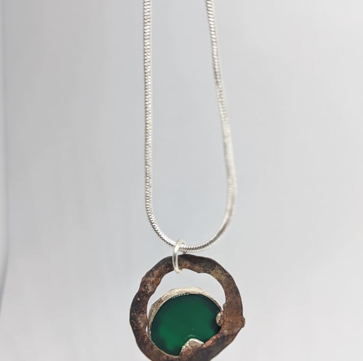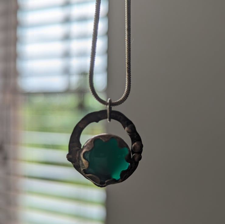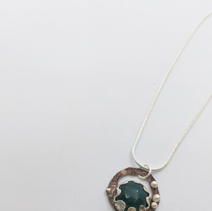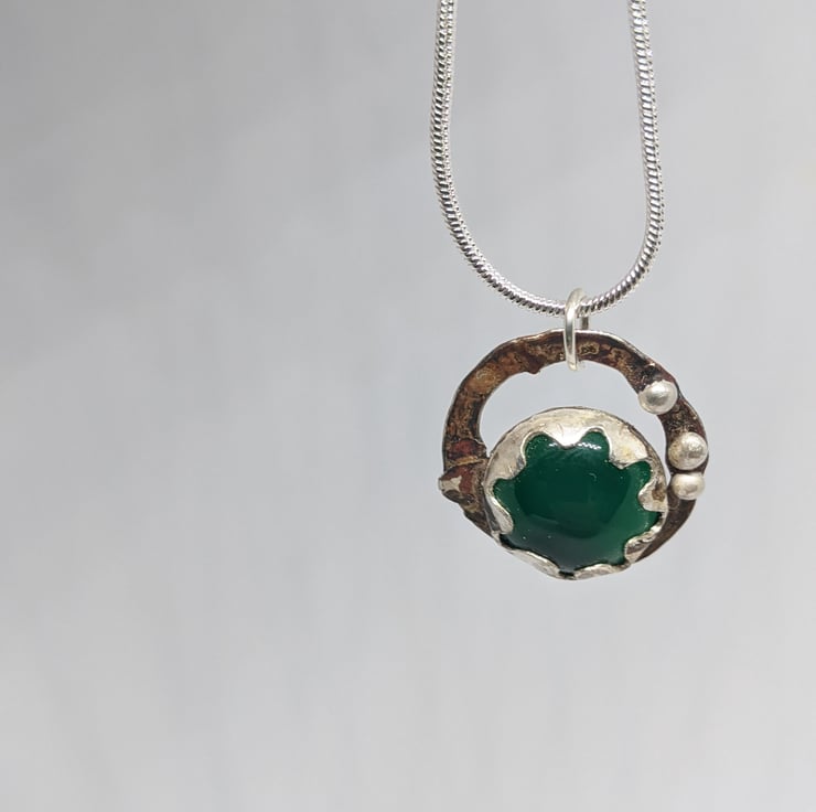 This quirky, bobbly, pendant is a fun addition to your wardrobe. The silver and copper have been naturally oxidised to contrast the smooth, shiny, green stone. A copper ring creates negative space whilst a scalloped bezel surrounds an off centre stone. The stone is partially backless to allow extra light to shine through - changing the hue of the green.