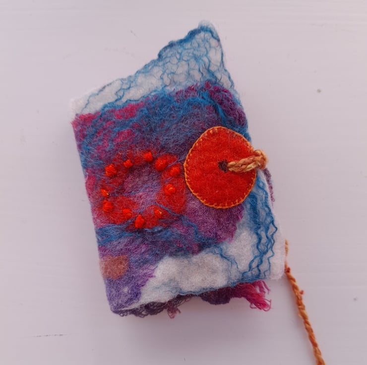 This listing is for one little book main photograph and is empty for you to put your own needles and ,or pins in . It is made from the Nuno Felting technique with applique and little tie to hold it together when full and has machine felt inserts and little pebble inserts.