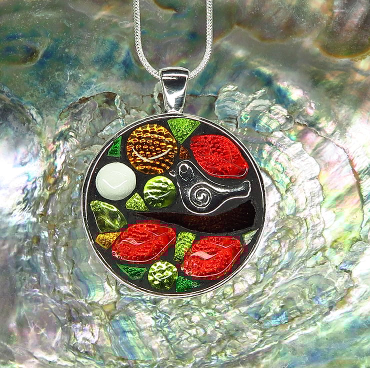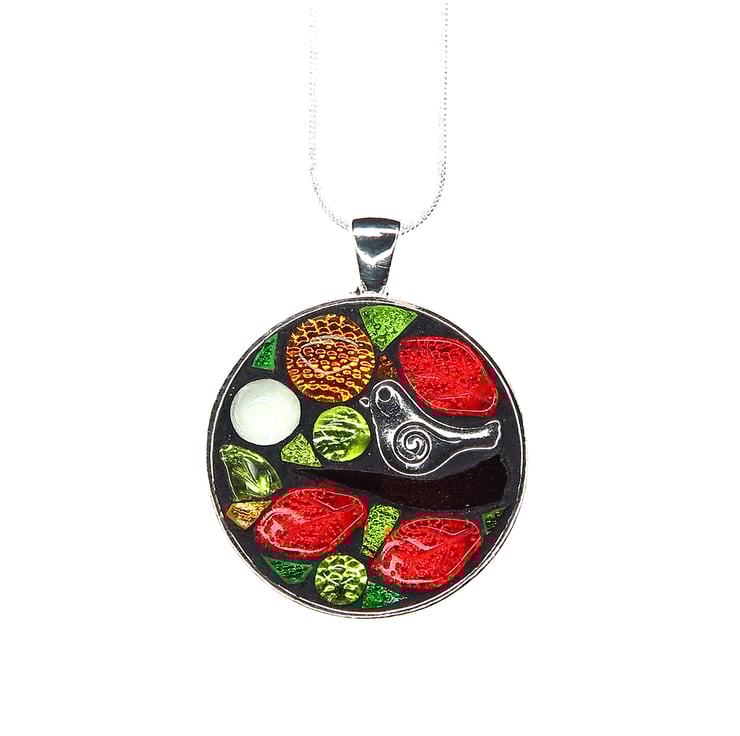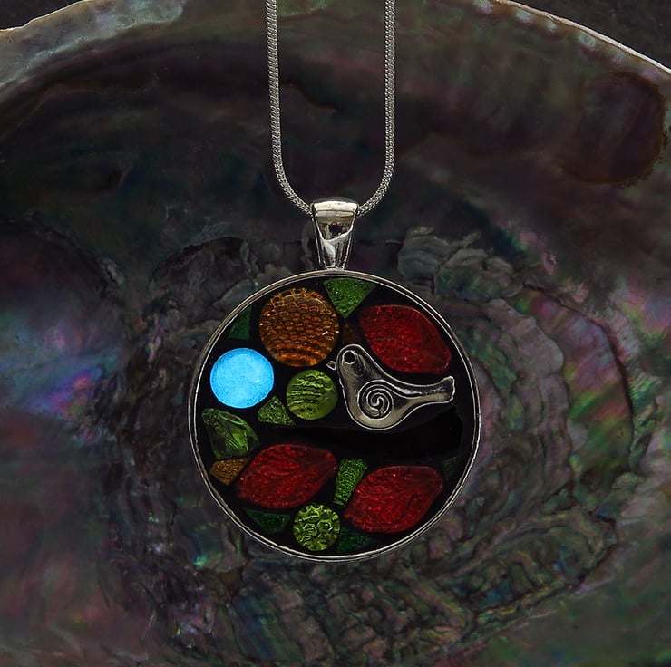 A stained glass and handmade glass bead pendant featuring a tiny bird perched on a branch surrounded by the colours of autumn and a glowing moon.