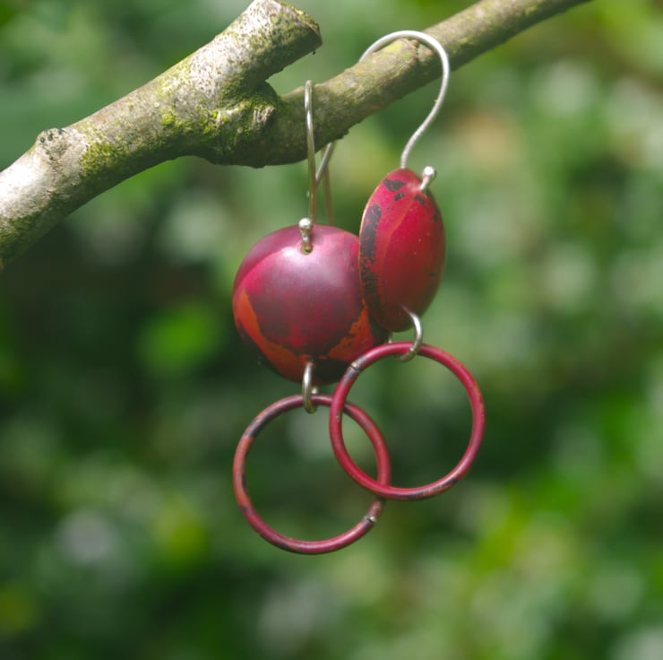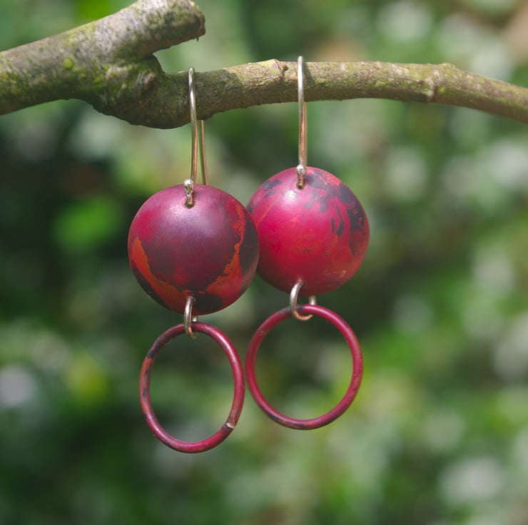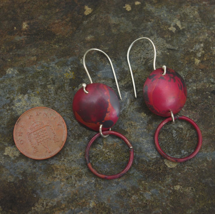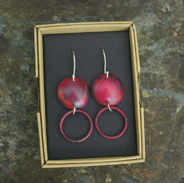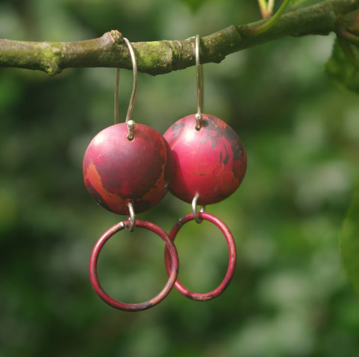 Red copper domed circles of 18cm joined to red wire copper circles of the same diameter, making a striking pair of statement earrings.