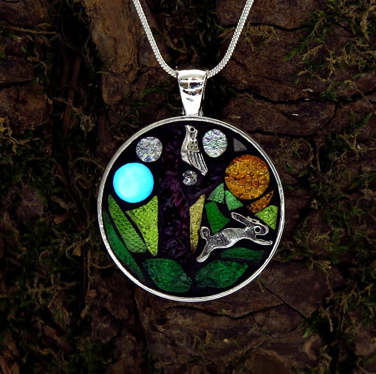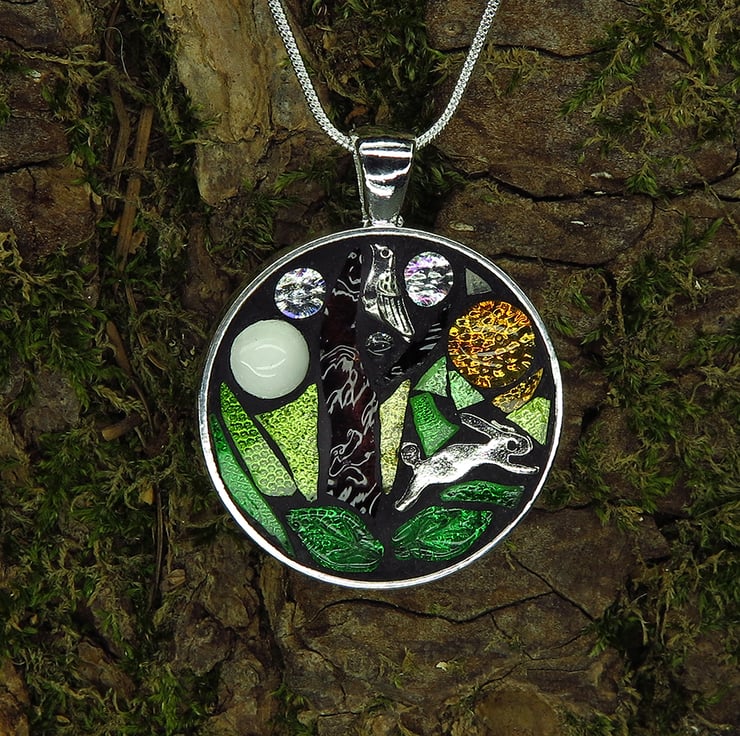 A stained glass and handmade glass bead pendant. Features a tiny hare, a bird on a tree branch and a glowing blue moon.