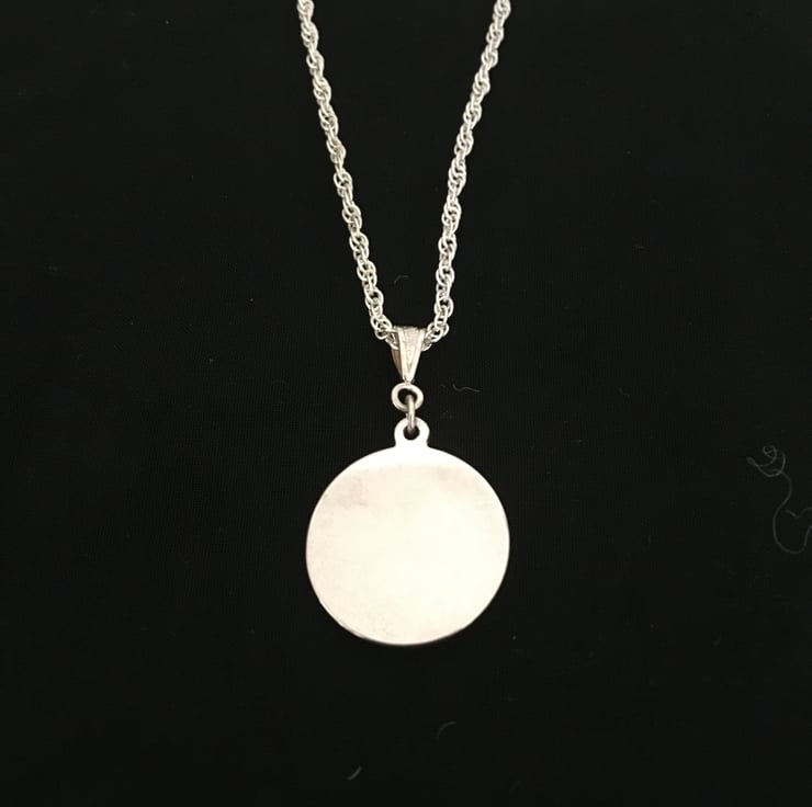 The pendant measures 0.75 in x 0.75 in and comes on an 18 in chain.