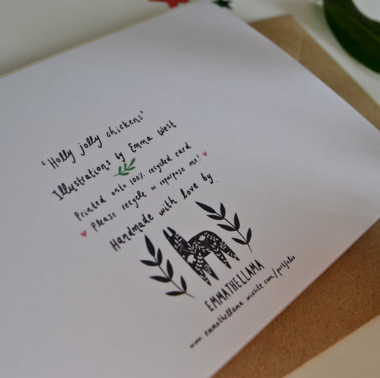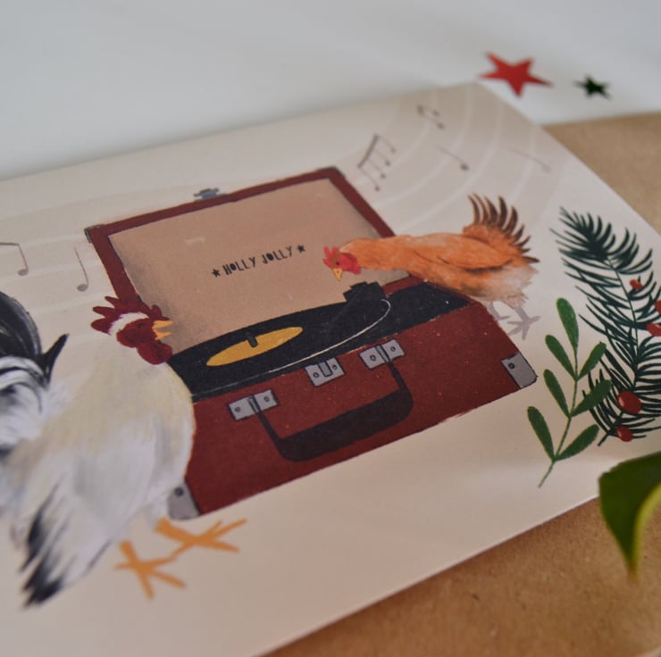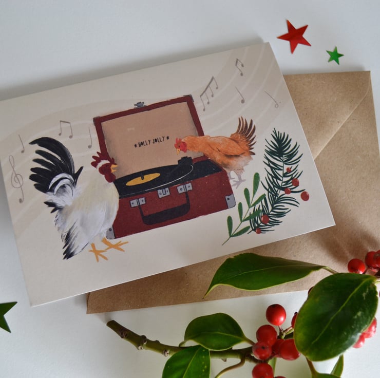 This Christmas card features an original digital illustration by me, of two chickens enjoying some Christmas music on a classic red record player. The illustration has been printed onto high quality 350gsm recycled white card in landscape orientation. The card is A6 in size (14.8cm x 10.5cm) and comes with a brown kraft envelope. This little festive card is also blank on the inside for your own personal message!