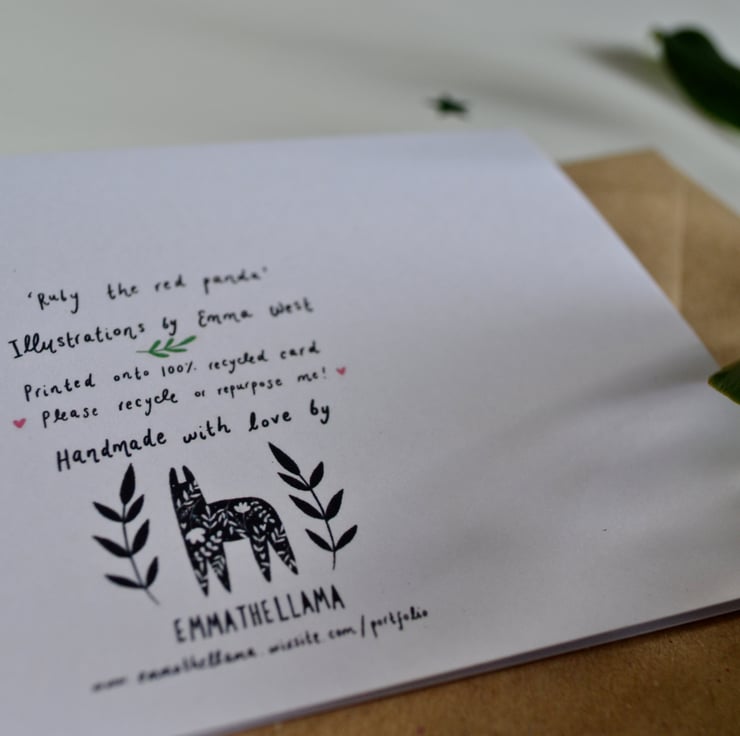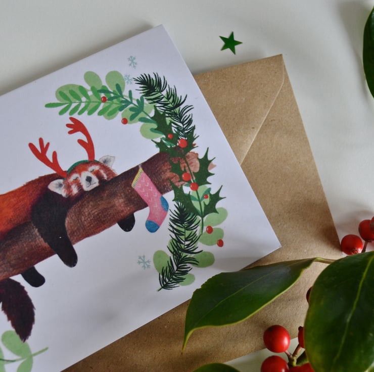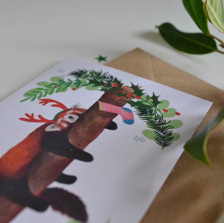 This Christmas card features an original watercolour illustration by me, of Ruby the red panda wearing some reindeer antlers and sleeping sweetly on a branch! The illustration has been printed onto high quality 350gsm recycled white card in landscape orientation. The card is A6 in size (14.8cm x 10.5cm) and comes with a brown kraft envelope. This little festive card is also blank on the inside for your own personal message!