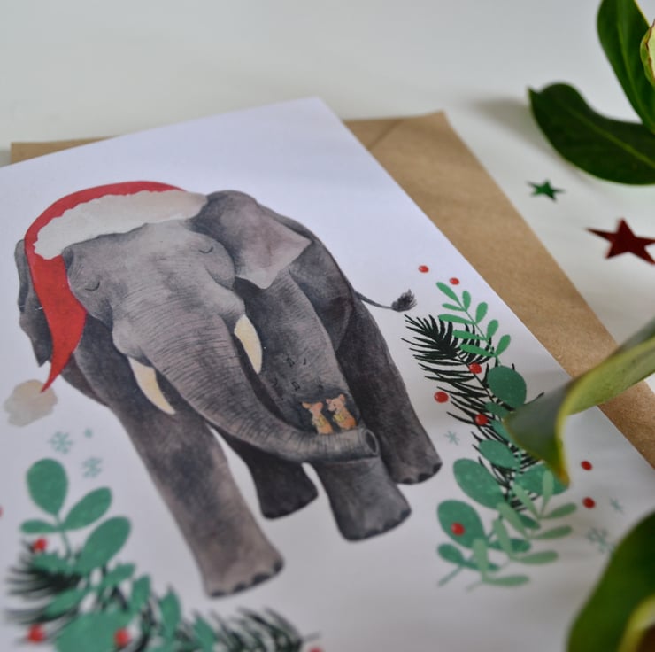 This Christmas card features an original watercolour illustration by me, of Eli the elephant with two little carol singing mice sitting on his trunk. The illustration has been printed onto high quality 350gsm recycled white card in portrait orientation. The card is A6 in size (14.8cm x 10.5cm) and comes with a brown kraft envelope. This little festive card is also blank on the inside for your own personal message!