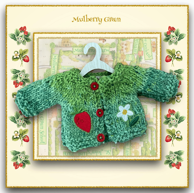 A cute little shaded green cardigan in Sheepjes Secret Garden yarn, to fit the Mulberry Green characters. The cardigan goes well with the strawberry dress.