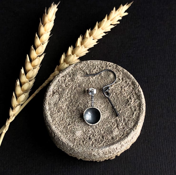 Mismatch spoon bowl and spoon handle stud earrings with hammered texture. One stud one dangle earring. Sterling silver mismatch earrings, available in silver or oxidised silver finish. Handmade in Sheffield.