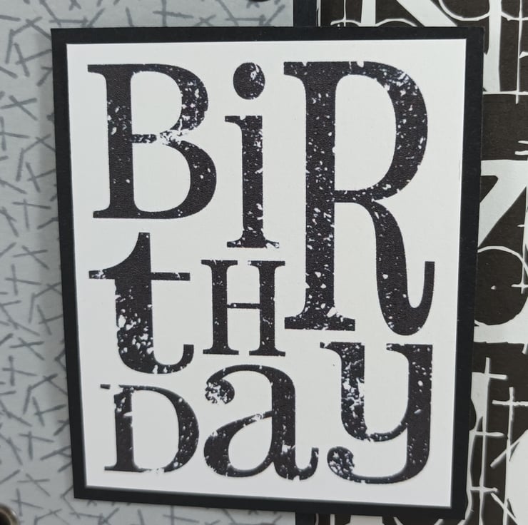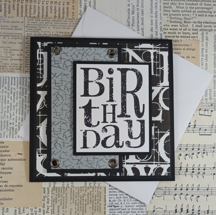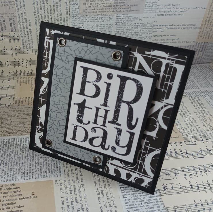 The sentiment 'Birthday' has been mounted onto black card over a stamped vellum panel with metal eyelets and overlaid onto black and white patterned paper