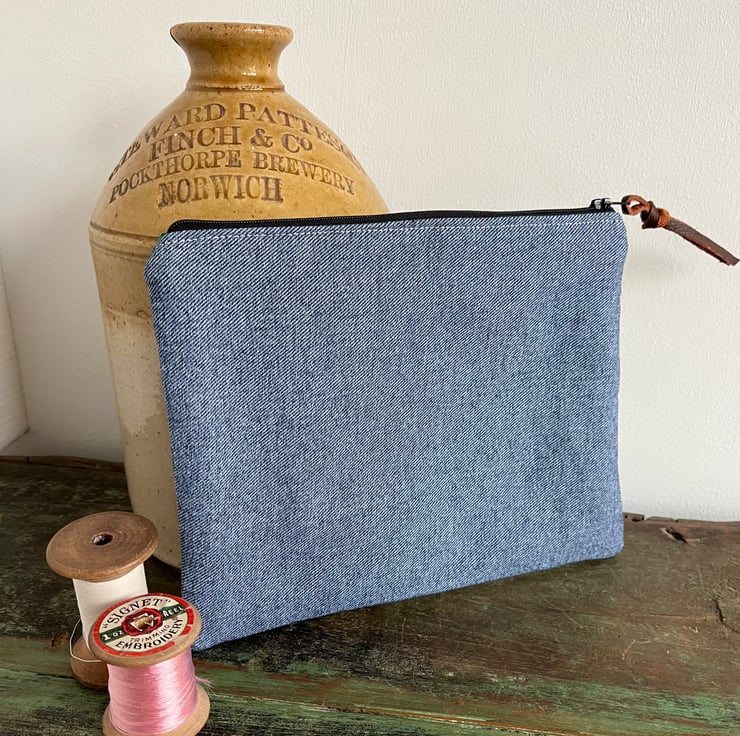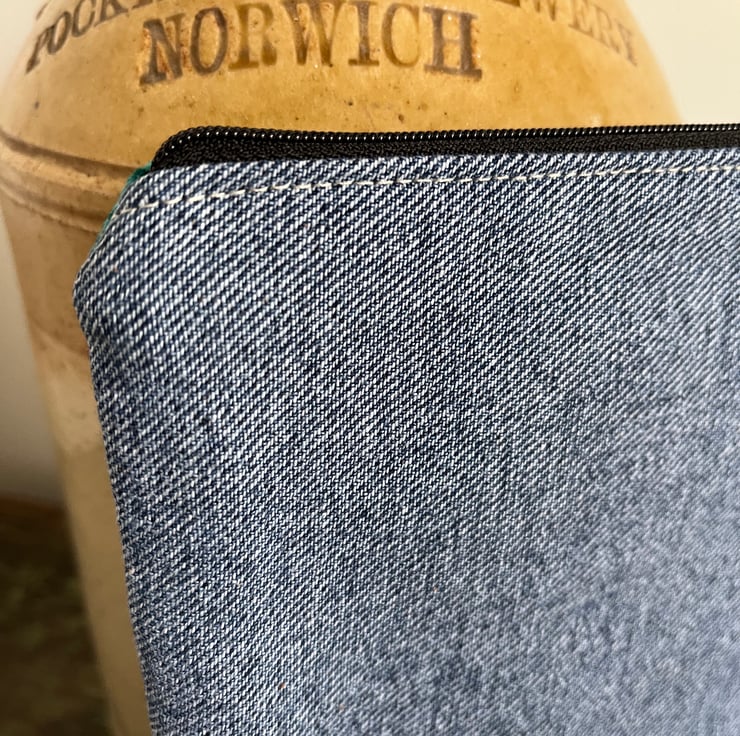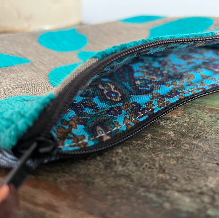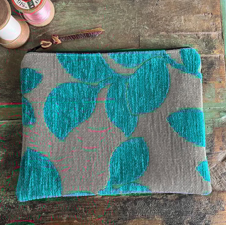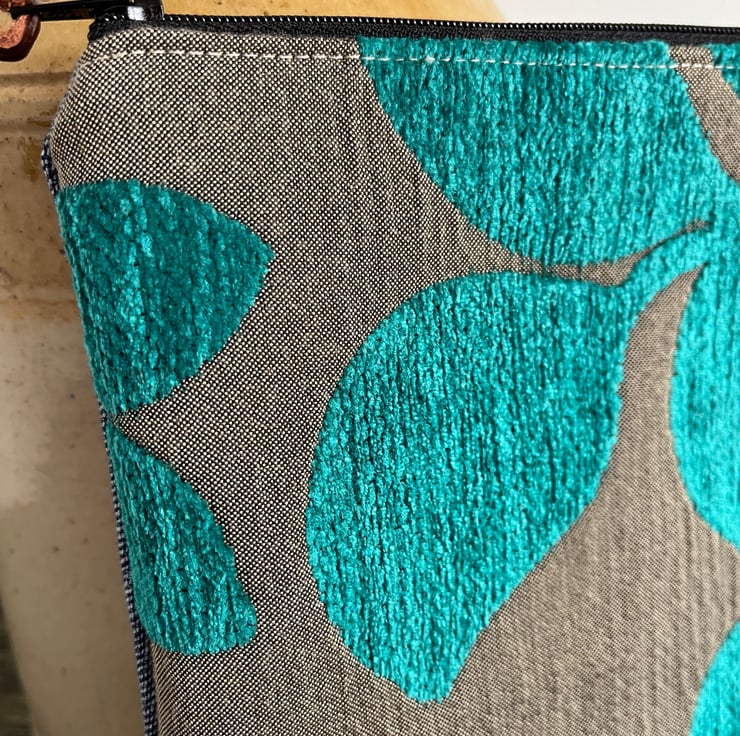 One of a kind zip pouch made from a sample of Liberty furnishing fabric with teal chenille pattern on a grey background. The pouch is backed with reclaimed denim from old jeans and lined with soft paisley cotton.