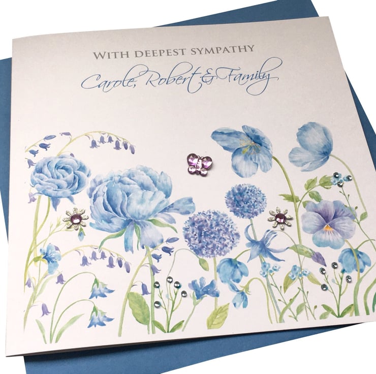 A Handmade personalised blue meadow Sympathy card, finished with silver flowers, butterfly & tiny blue diamante detail.