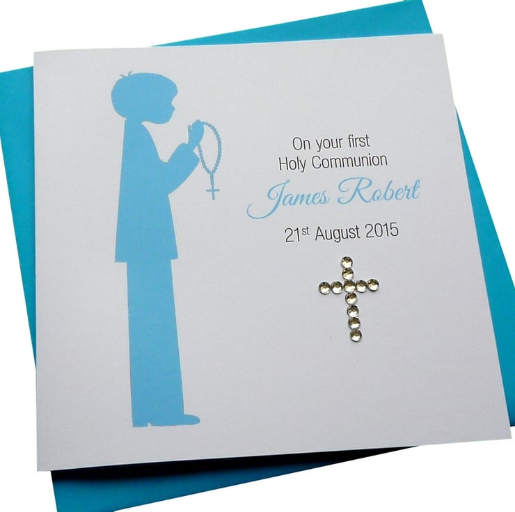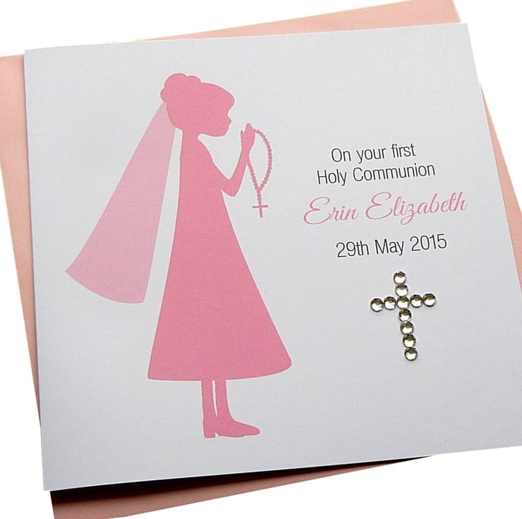 A Handmade personalised first Communion card, finished with a clear diamante cross.