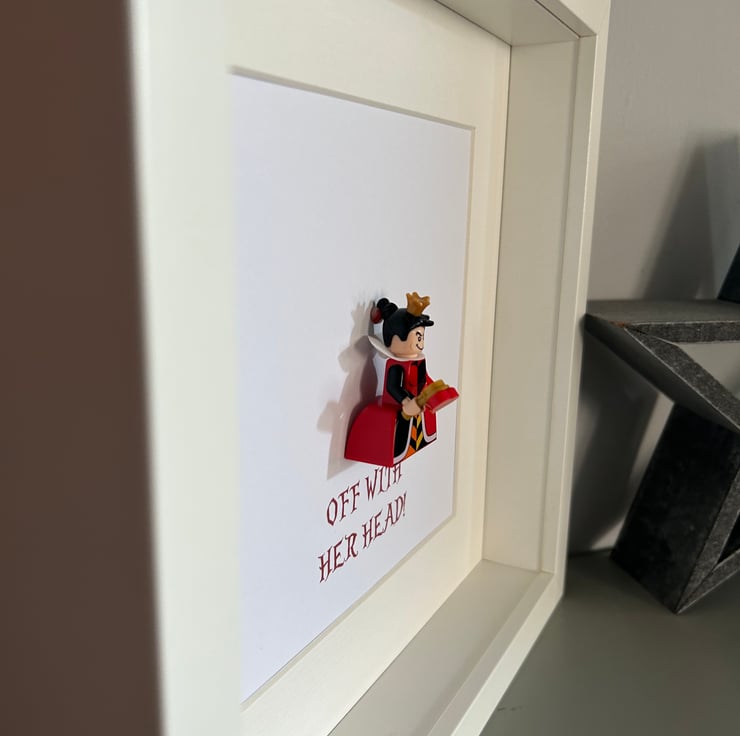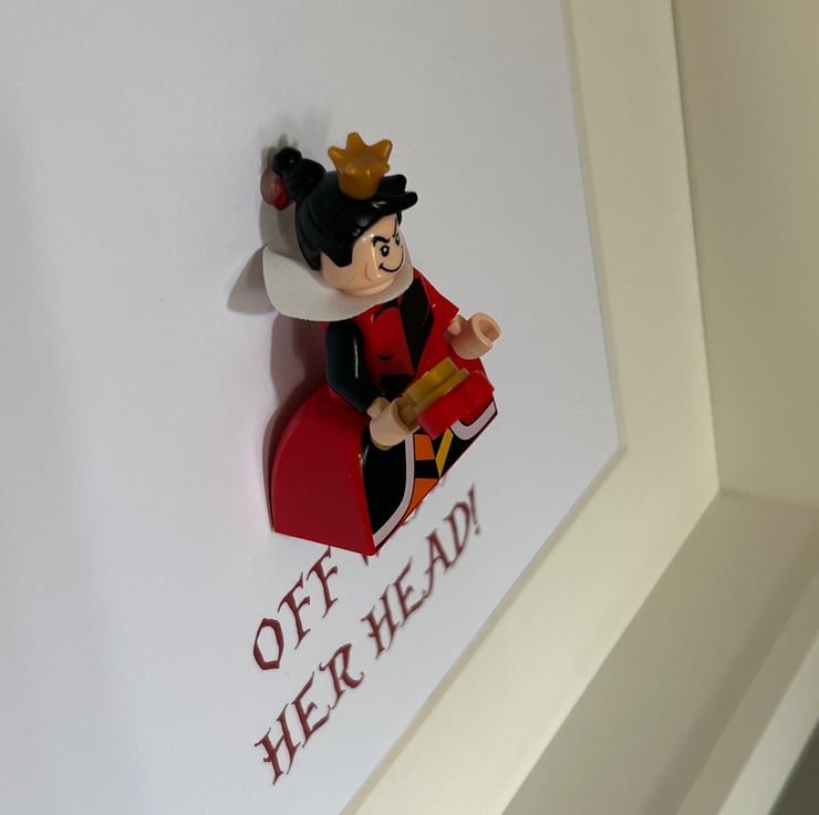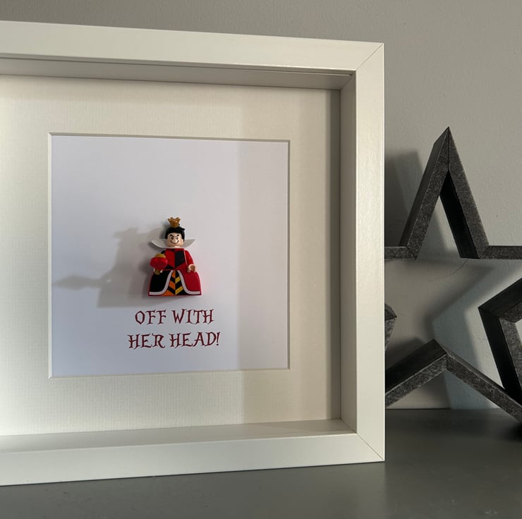 This frame features none other than the Queen of Hearts from Alice in Wonderland, decked out in her full regalia. She has been mounted in to a deep box frame along with a classic line from the movie.