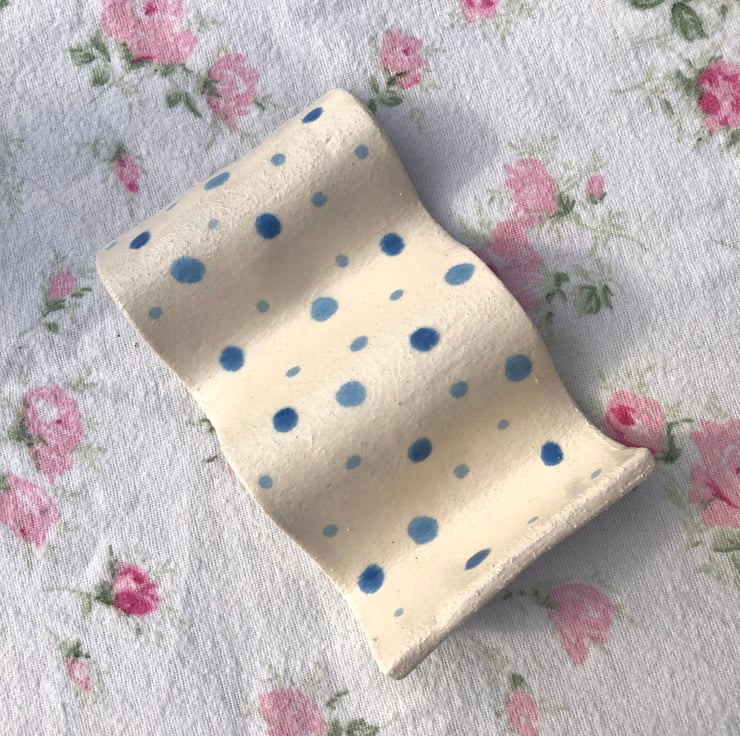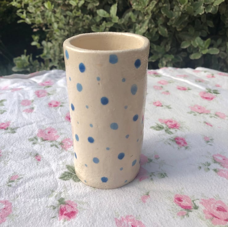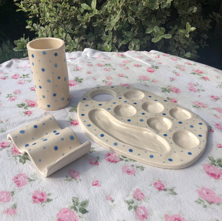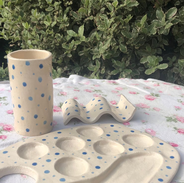 The set is made from white grogged clay and has been decorated with pretty blue dots, then sealed with transparent glaze to avoid staining.