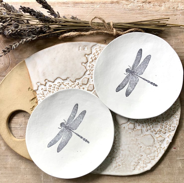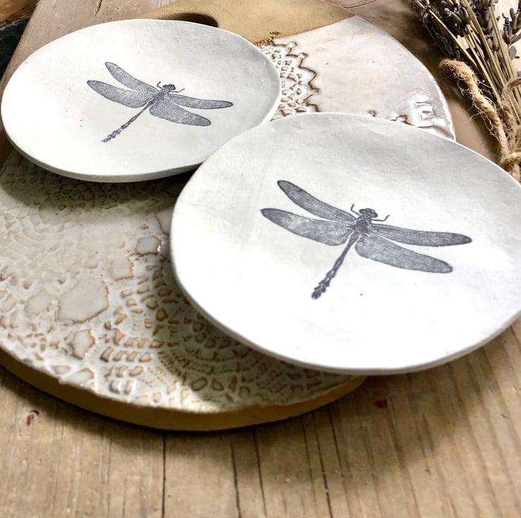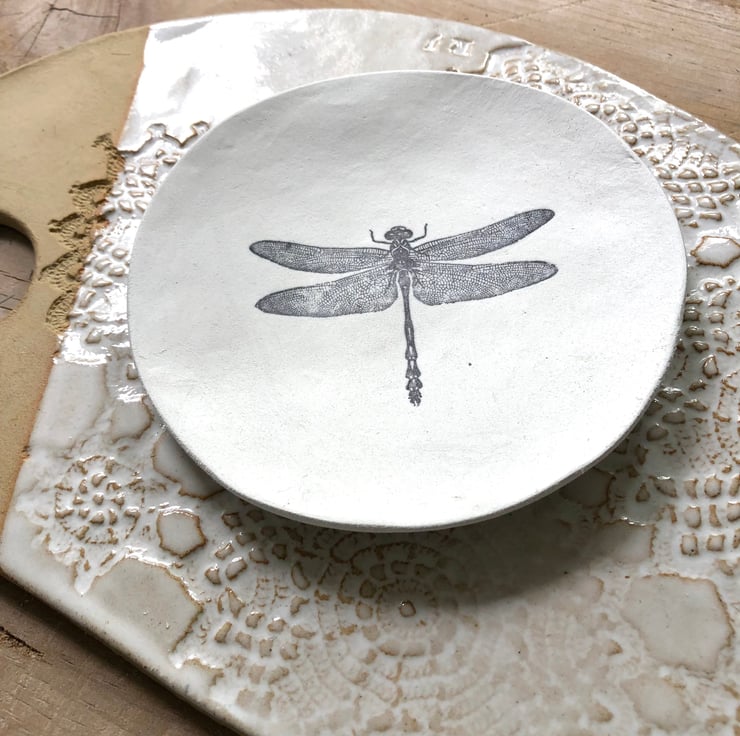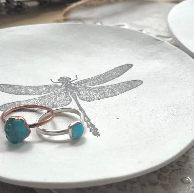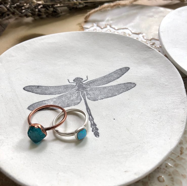 Beautiful handmade unique jewellery dish, with a gorgeously detailed dragonfly stamp. Ideal to put next to your bed or kitchen window, or to give to friends as a special gift.
