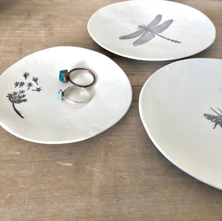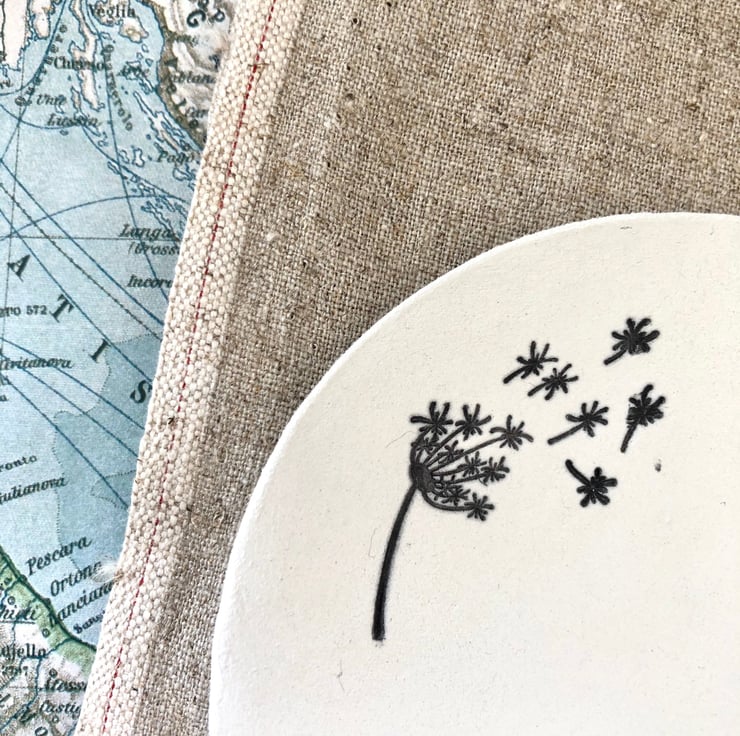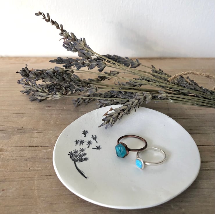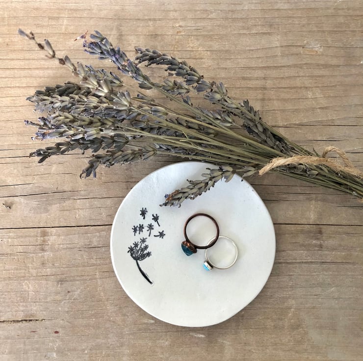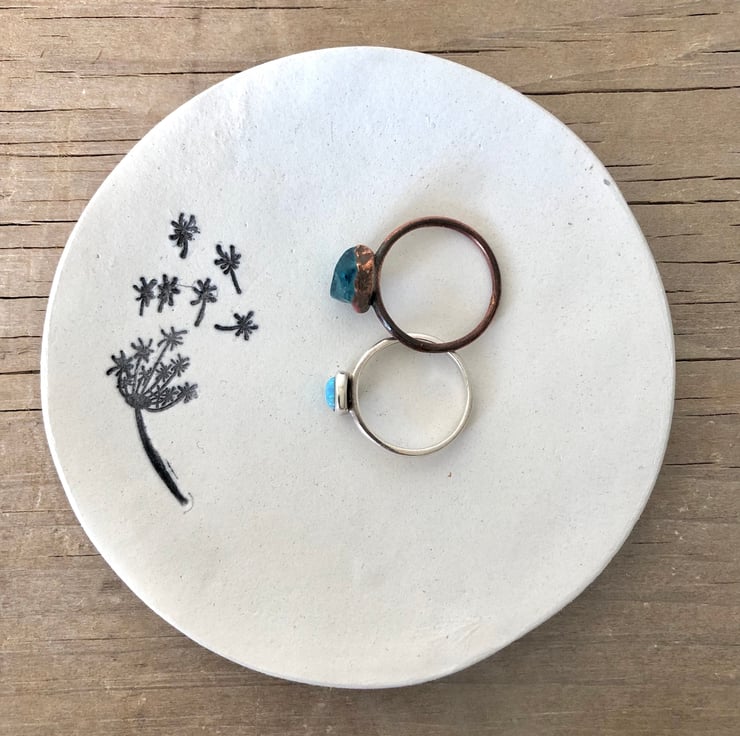 Beautiful handmade unique decorative dish, using a hand stamped dandelion flower head for a botanical finish. Ideal to add to the Lucky Penny collection, to put next to your bed to use as a ring holder, to add a rustic feel to your home or to give to friends as a special gift. It can also be personalised for you too