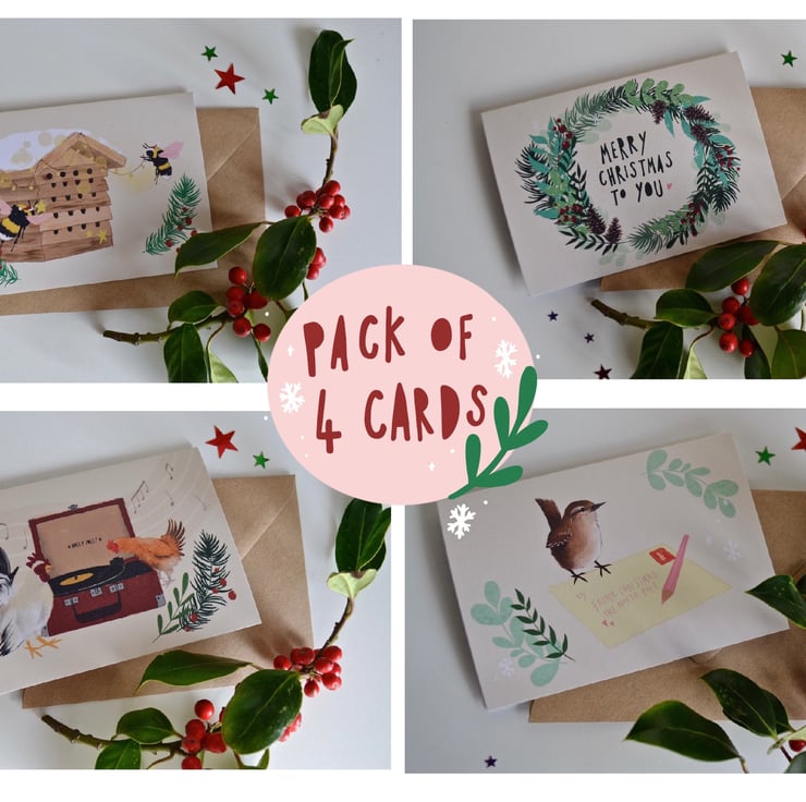 This pack of 4 Christmas cards includes one of each design from the Garden collection!