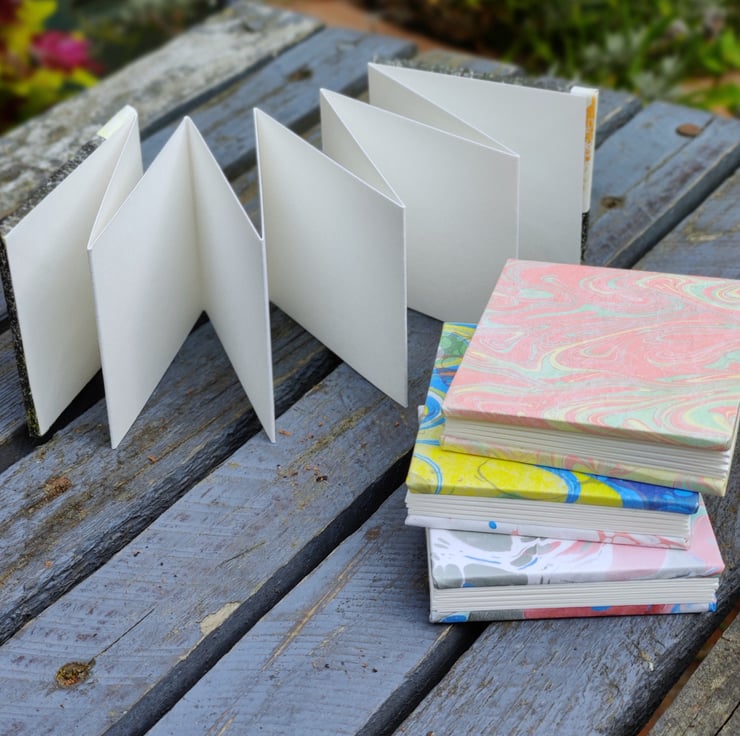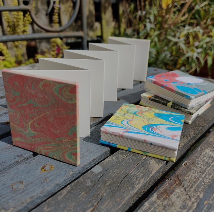 These hand made mini concertinas are 6 x 6 cm square made with 300gsm paper.